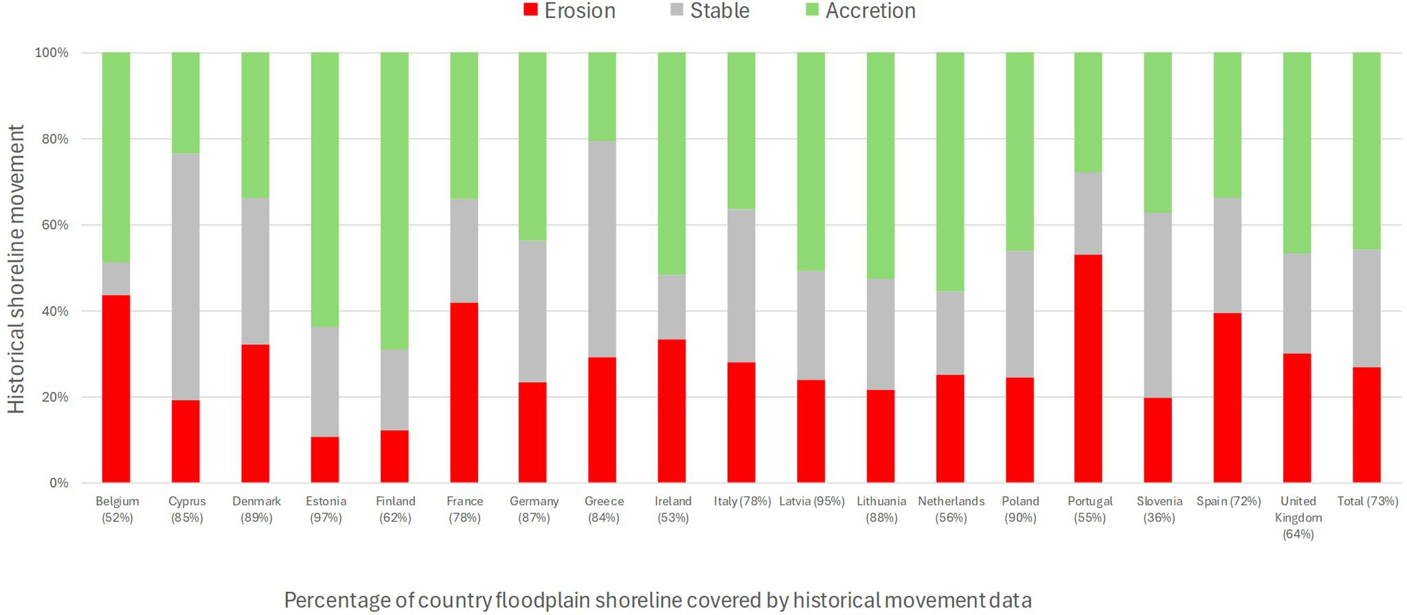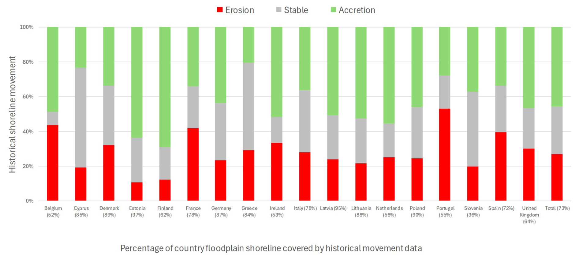 Figure 5Percentage of erodible coastal floodplain shorelines in the database by country and total with historical movement trends, irrespective of human activity and coastal type. Excludes erosion-resistant shorelines, ports and harbours and shorelines with no data.