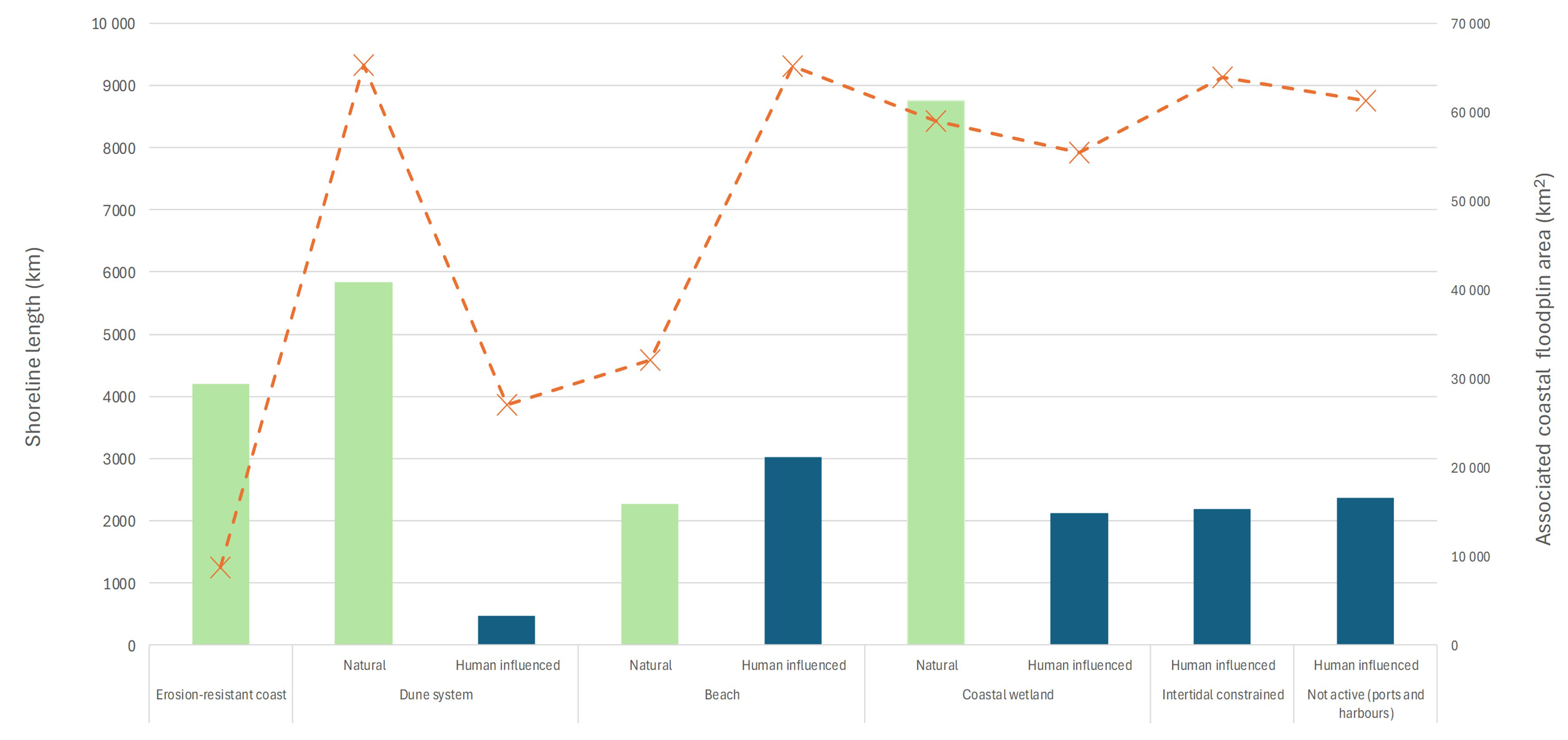 The current coastal geomorphology along the floodplain shoreline is most frequently natural (undeveloped and without structures/infrastructure) coastal wetlands and dune systems which are associated with extensive local floodplains (Fig. 6). For these shorelines, landward movement (represented as erosion) is found along around 3500 km (34 %) of floodable shoreline and is part of the natural (unrestricted) evolution of the coastal system. The majority of these combined geomorphological classes are associated with open scrubland with less than 125 km (< 4 %) of the eroding shoreline associated with developed areas and 540 km (< 16 %) with agricultural land.