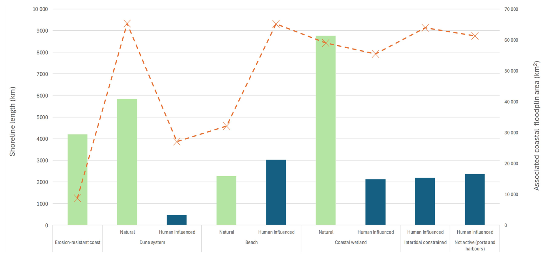 Figure 6Distribution by length (km) of coastal classification with associated local floodplain areas.