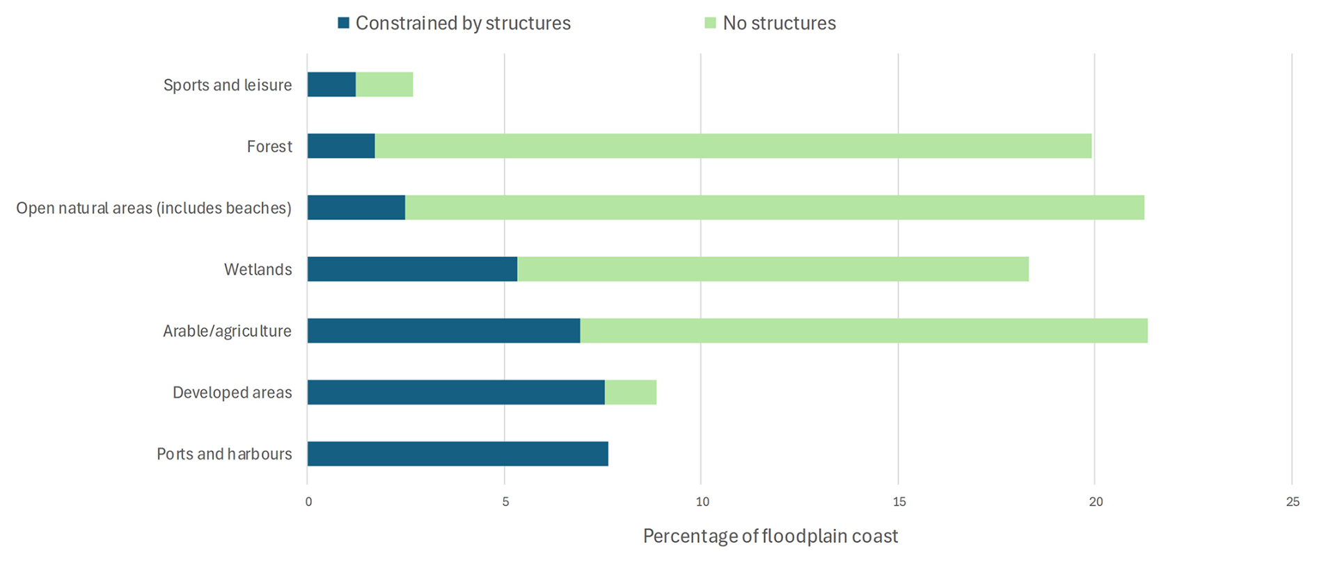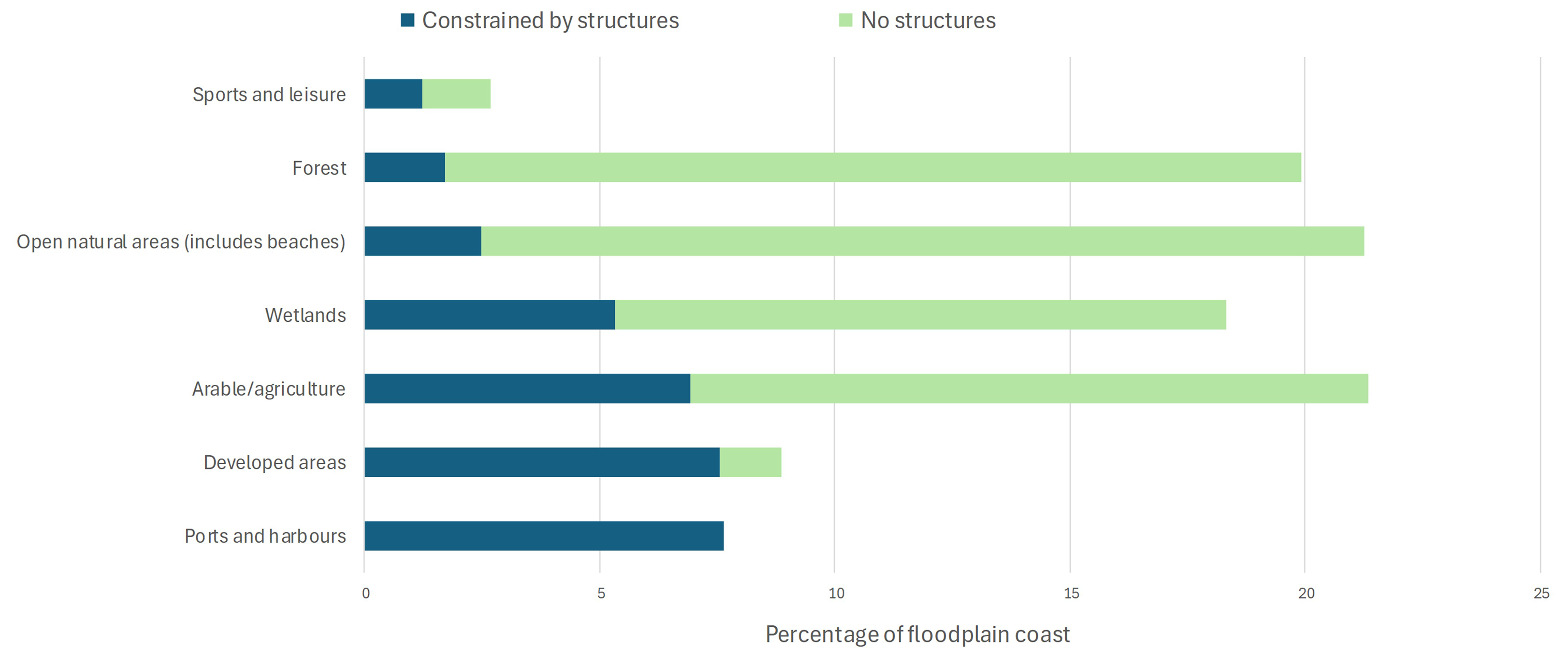 Figure 7Percentage of floodplain coast that is constrained by structures or has no structures, identified by land cover types.