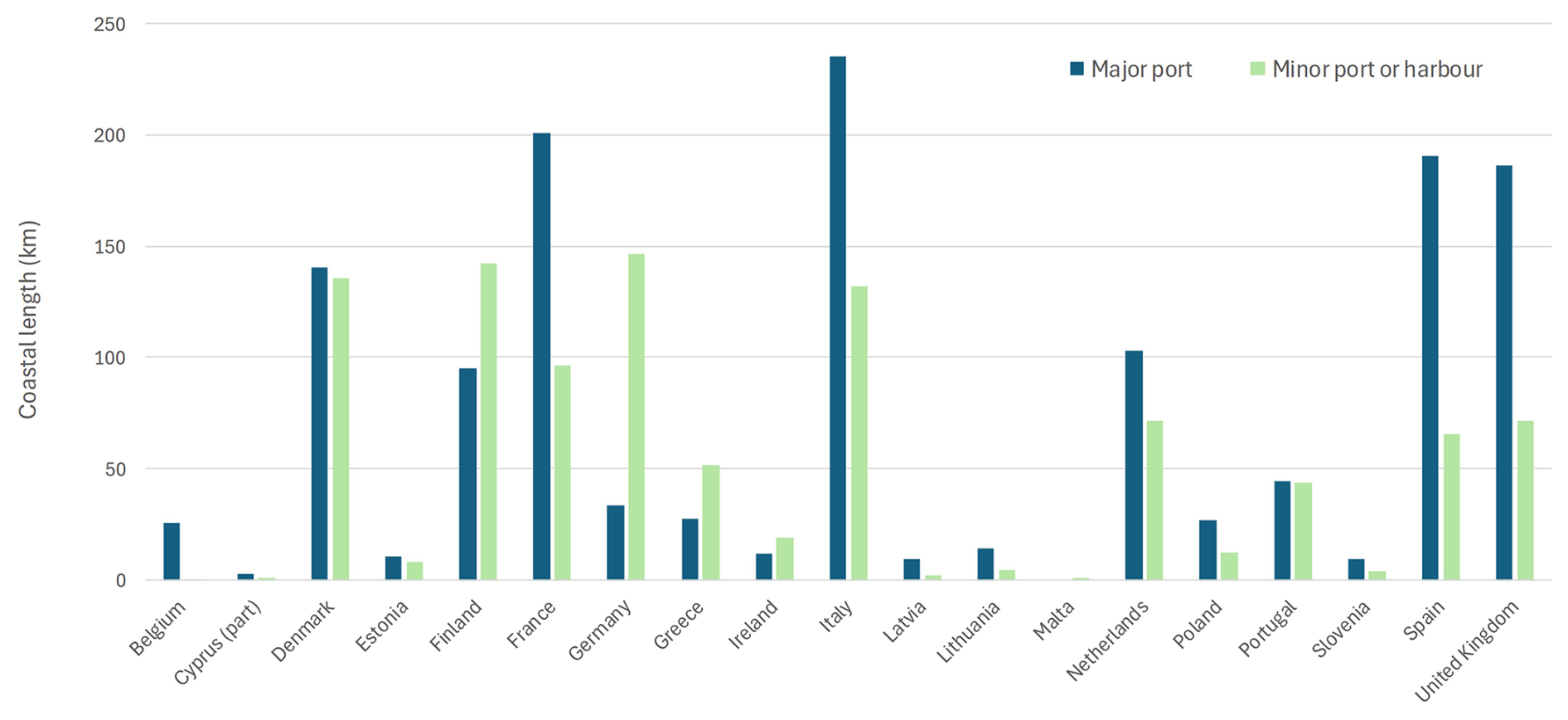 As engineered structures, ports and harbours represent fixed sections along the coast with the necessary infrastructure exposed directly to changing water levels and requiring continual maintenance and upgrade. Major port infrastructure in particular is unlikely to be abandoned even if the port itself is relocated (e.g., Andrade et al., 2024). Figure 8 shows that Italy has the longest length of open coast designated as major port infrastructure in floodplains followed by France, Spain and the UK. Germany, Denmark and Finland, with their large number of islands, have long extents of secondary ports and other harbours. It should be noted that some large ports are not included in the database as a geomorphological landform exists seaward (e.g., the land reclamation – Maasvlakte-2 – seaward of the Port of Rotterdam is fronted by an artificial beach) and some ports may be over represented by length due to the form of the shoreline.