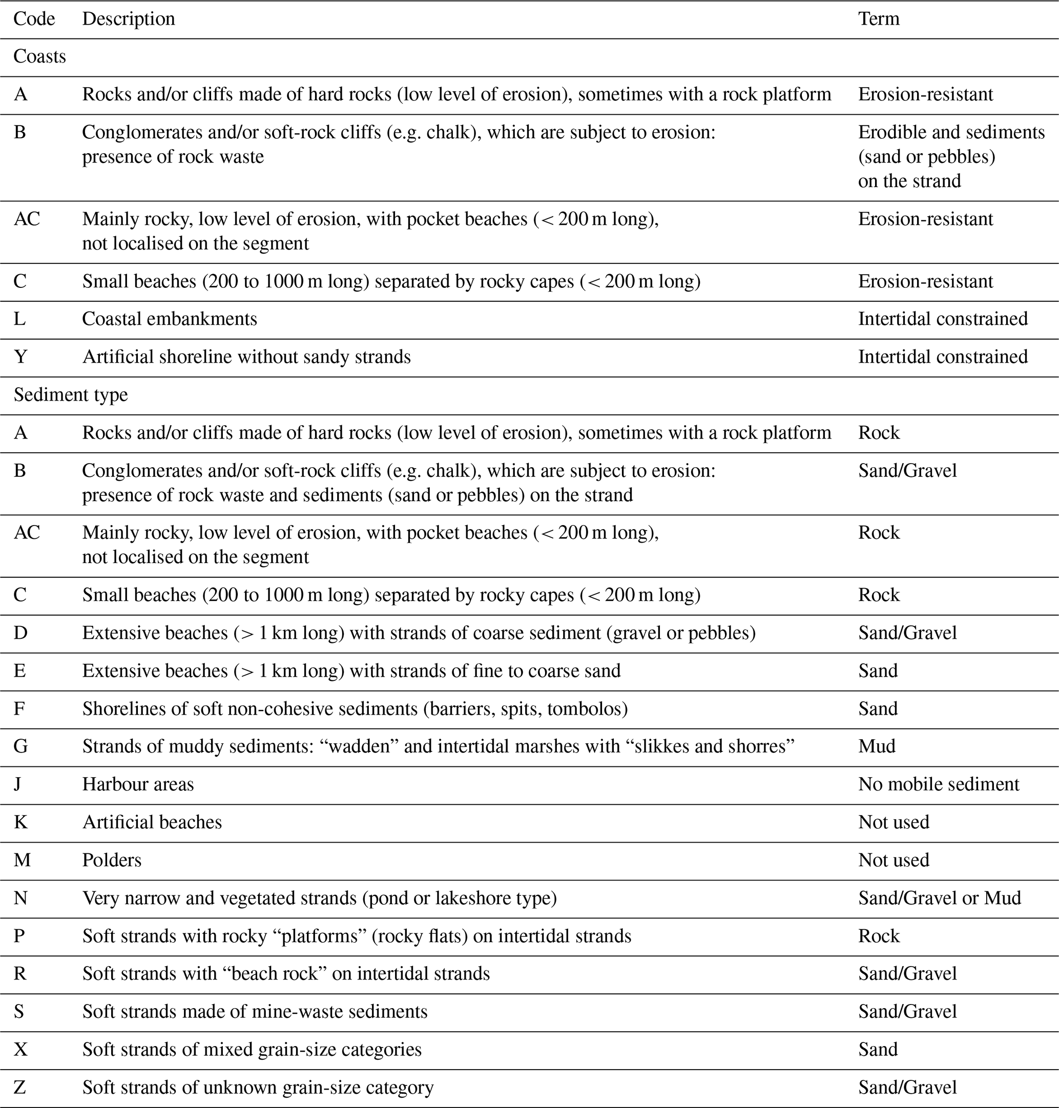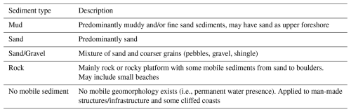 Coastal sediment type is an important characteristic indicative of coastal change and erosion; rocky coasts and foreshores tend to have different erosional dynamics than sandy coasts for example. Each coastal segment therefore has simplified sediment information based on the Eurosion dataset (see Table A1 and Eurosion, 2003) validated by visual interpretation. Four sediment types were defined (Table 2) and applied according to the sediment present at the shoreline. An additional fifth class of “no mobile sediment” was needed to describe segments where no mobile geomorphology was present, mostly found associated with ports and harbours (human infrastructure) and some erosion-resistant coasts. Where two sediment types are present (e.g., a sandy beach at the edge of a muddy estuary), this was also recorded.