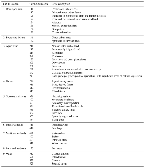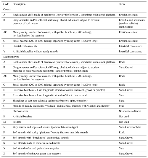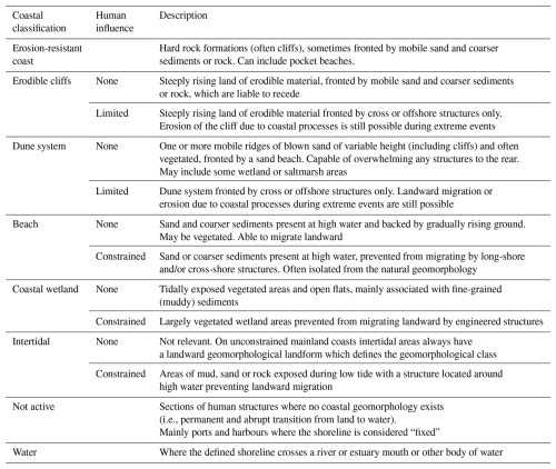 Building on the coastal characteristics, as a first step, a distinction between erodible and erosion-resistant coast largely based on the Eurosion classification codes (Eurosion, 2004; see Table A1) was developed. Erosion-resistant coastal segments follow the Eurosion codes A and C, described as mainly “rocks and/or cliffs made of hard rocks (little subject to erosion)” or “mainly rocky, little erodible, with pocket beaches (< 200 m long)”, respectively. The remaining segments were then considered to be erodible and, as a second step, were classified according to a four-class geomorphological typology based on coastal landforms. This typology identifies the dominant mobile geomorphological landform on the natural cross-shore profile, effectively (erodible) cliffs, dunes, beaches and wetlands.