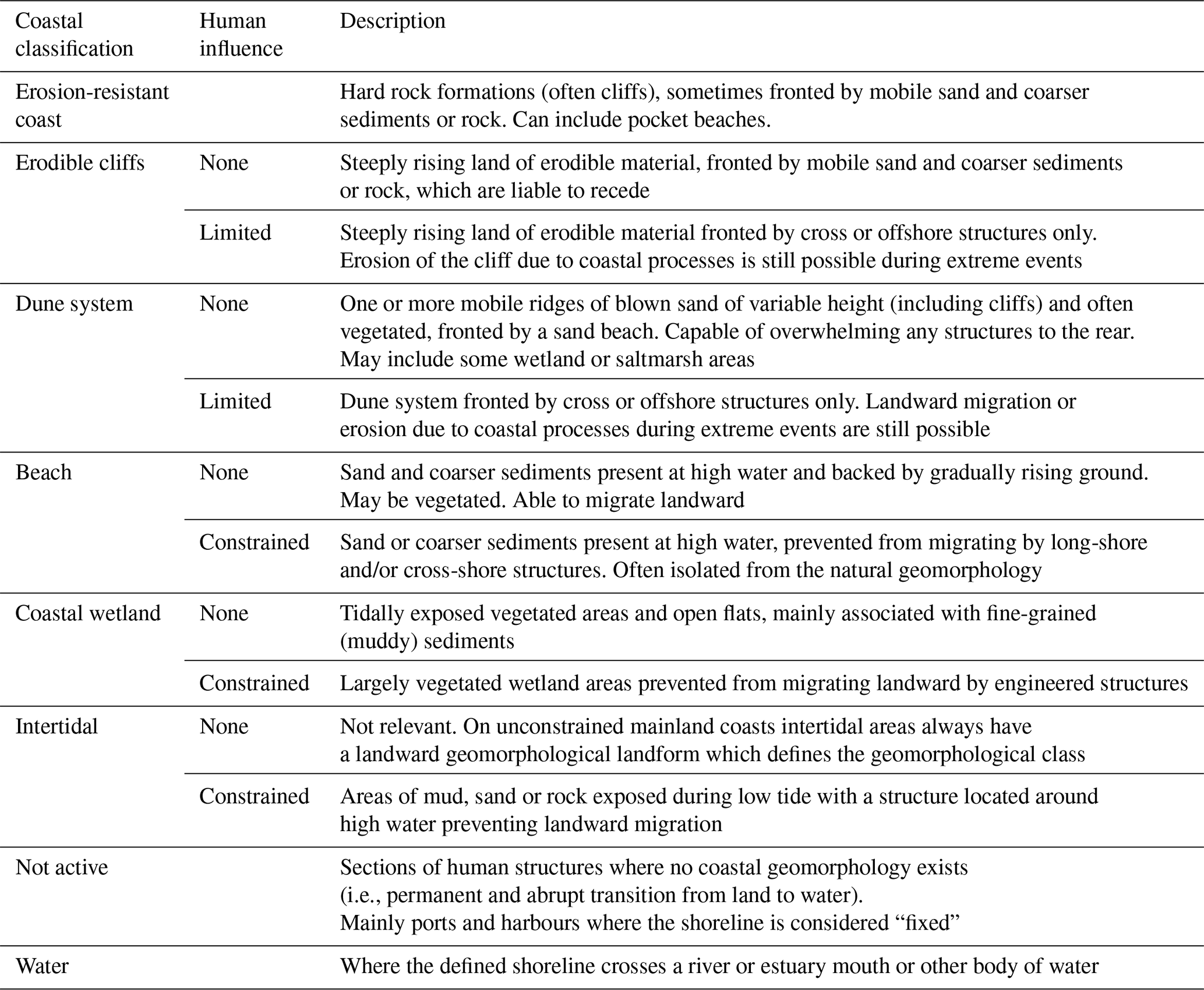 As a third step, where an engineered structure restricts the ability of the coastal profile to migrate landward (or erode), the geomorphological class is redefined to include just the landforms that are still responsive to coastal processes (i.e. seaward of the structure). Structures/infrastructure may constrain or limit coasts as follows: (1) constrained coasts where a shore parallel structure forms a continuous fixed boundary which prevents potential landward movement, for example, a seawall or promenade; and (2) limited coasts where structures may reduce but not prevent landward migration, especially during extreme events, for example, an offshore breakwater. Where coastal structures/infrastructure define the shoreline and there is no natural coastal geomorphological landform (most commonly found at ports and harbours), the shoreline is considered to be geomorphically “not active” (Table 3).