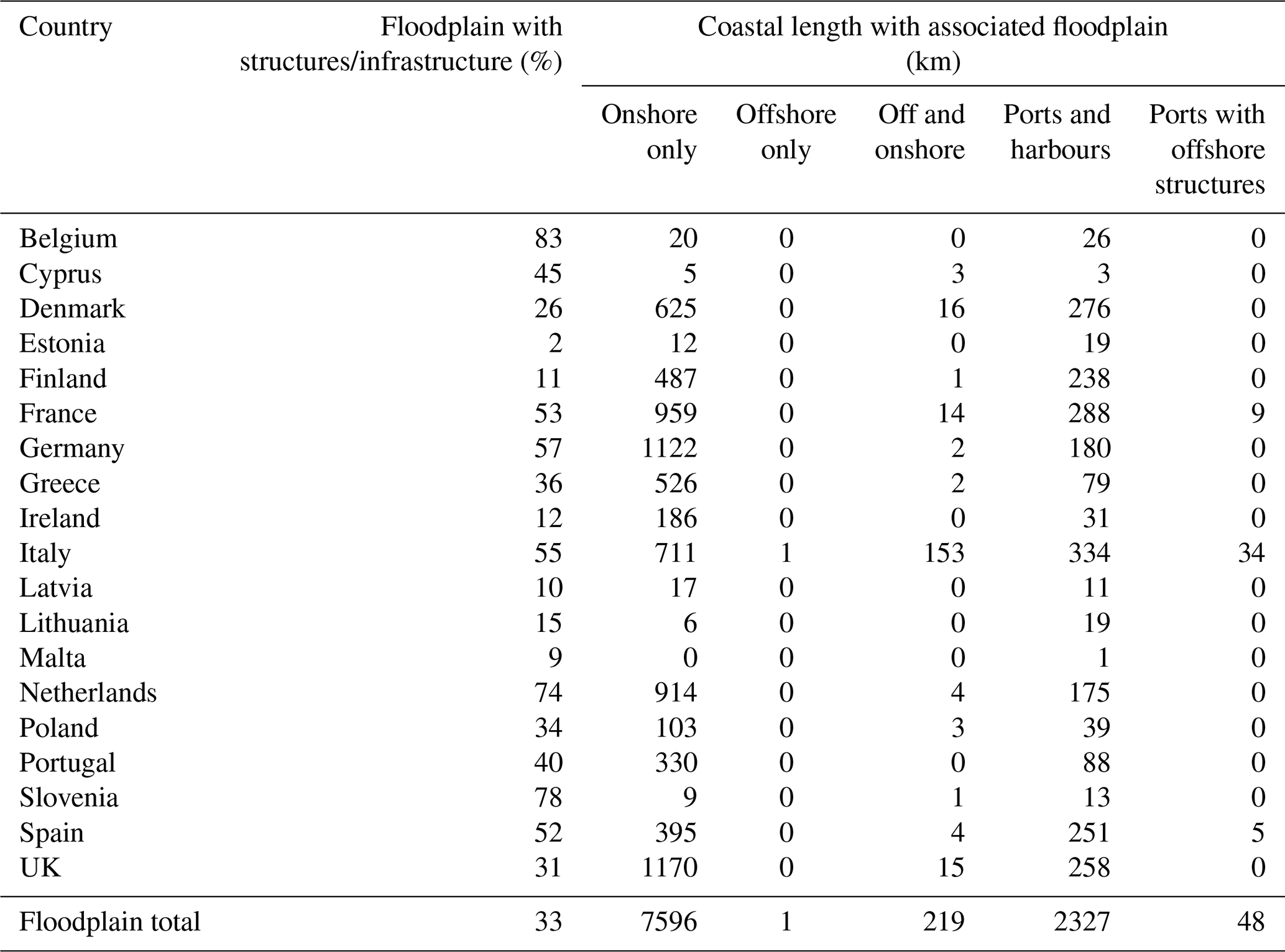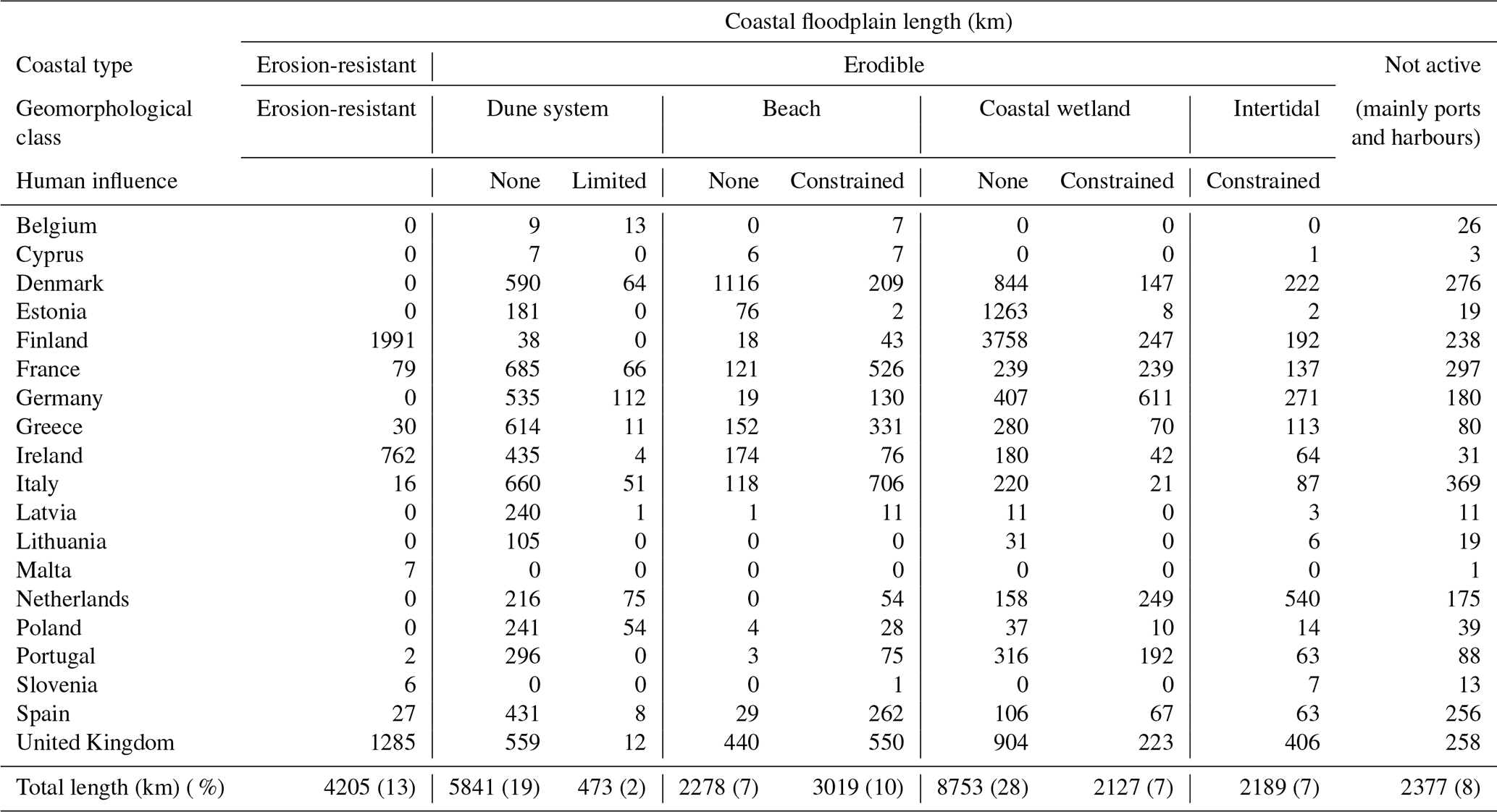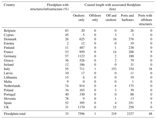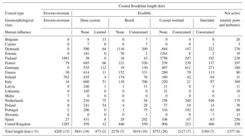Table 4Coastal length (km) associated with floodplains by coastal typology and country (see Table 3 for details about the various classes).