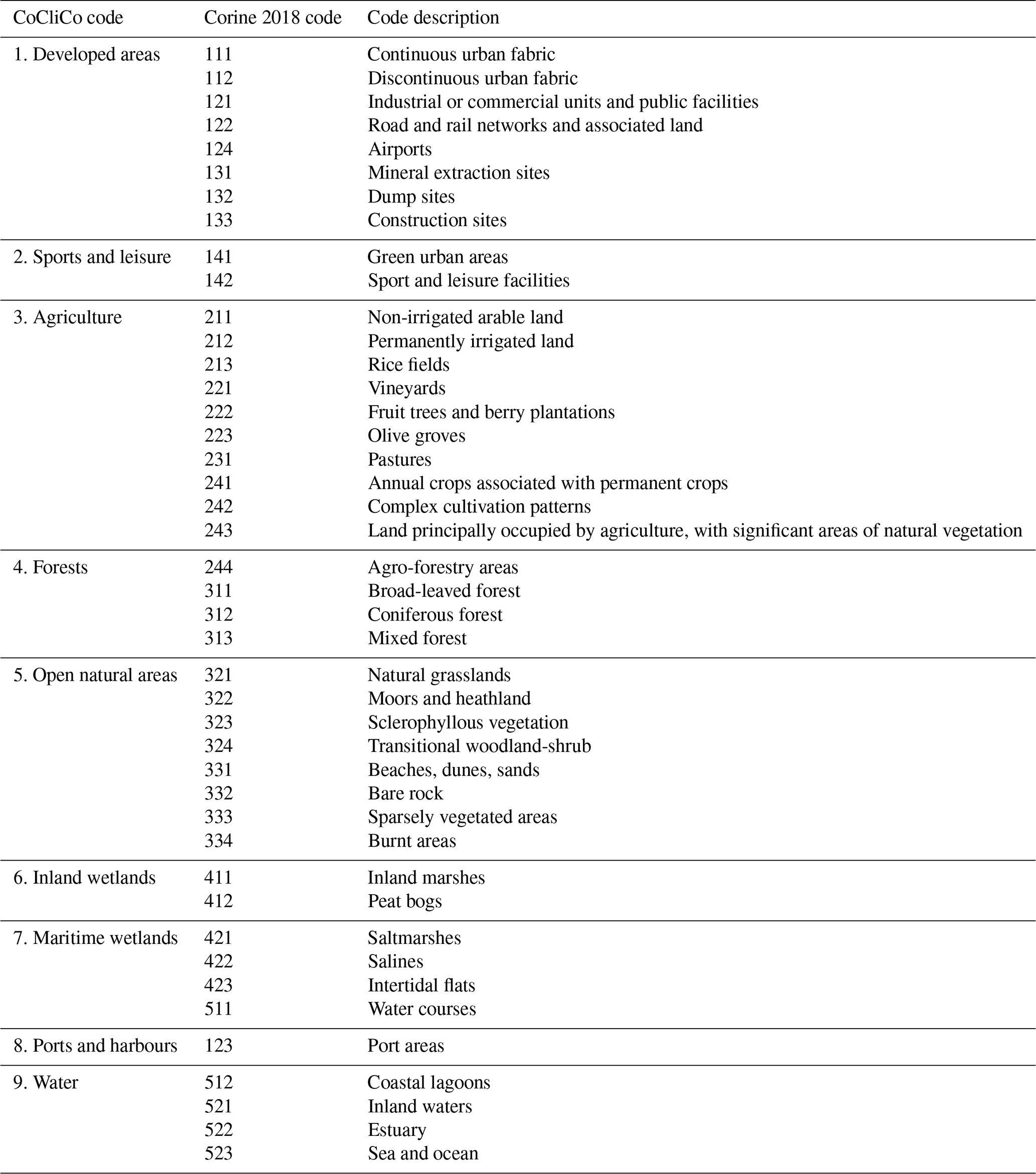 As the potential impact of erosion or landward migration is mainly determined by the value and use of any land affected, the Corine 2018 land cover dataset (CLC, 2020) was utilised. Corine 2018 identifies 43 land cover categories which were re-grouped and simplified into 7 classes to represent developed, agricultural and natural areas (see Table A2 for details). Each segment was allocated the simplified code according to the land cover within the 100 m coastal zone. The positional accuracy of this data set is 100 m or better with a spatial resolution of 25 ha/100 m (CLC, 2020), and was amended, if necessary, based on visual interpretation of satellite imagery.