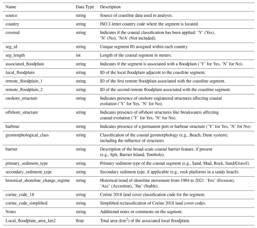The CoasTER database represents an improvement over existing European coastal erosion datasets (Eurosion; EEA, 2004) by linking this data to flood characteristics. It refines earlier work by reclassifying and harmonizing data from different sources, such as land cover classification and historical shoreline movement (see Luijendijk et al., 2018). Additionally, the underlying coastline dataset has been manually corrected to remove digitization artifacts and generalized where possible. A key improvement of this dataset is the inclusion of engineered coastal structures and infrastructure. By systematically mapping sediment type, land cover, coastal structures/infrastructure, floodplain identifiers, shoreline movement, and geomorphological classification onto a consistent, standardised shoreline, the dataset provides a robust foundation for large-scale coastal erosion and flood analysis.