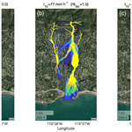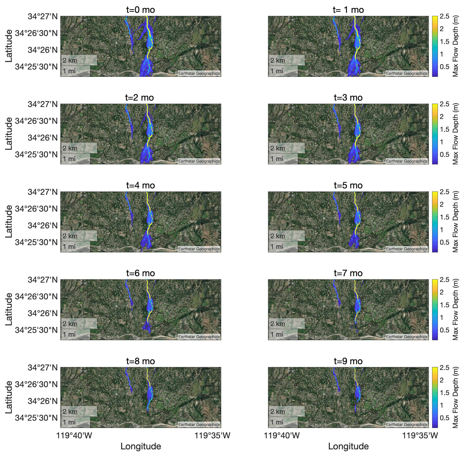 Liu et al. (2021) developed parametric best-fit curves to model the change in saturated hydraulic conductivity and hydraulic roughness as a function of time following fire in the nearby San Gabriel Mountains. Using these relationships, and setting other parameters to the center of their respective ranges, we used the GP emulator to explore the effects of temporal changes in the hydraulic roughness coefficient and saturated hydraulic conductivity. Both peak flow depth and area inundated in response to the observed rainstorm would decrease substantially over the first six months following fire (Fig. 6). For example, US Highway 101, which runs perpendicular to the direction of flow near the distal portion of the fan, would only be inundated when the rainstorm occurs within the first 3 months following fire. If the observed rainstorm were to have occurred 12 months following the fire, the simulated inundation area would be limited to channels near the fan apex.