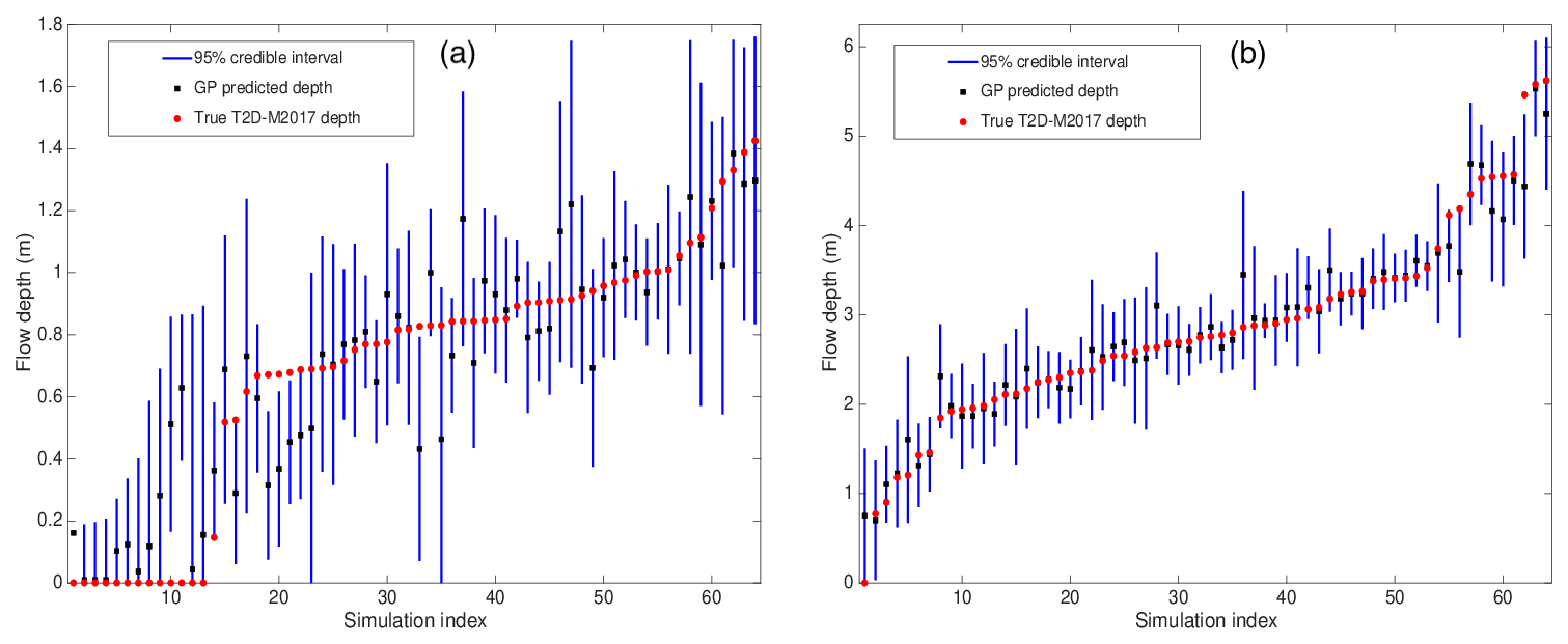 Figure 3Leave-one-out experiments for (a) a location on the fan and (b) a location in the channel (see Fig. 7 for details). In each panel, indices were sorted based on the T2D-M2017-simulated peak flow depth (red dots). GP predictive means for these left-out scenarios were plotted as black squares while the 95 % credible intervals were plotted as vertical blue bars.