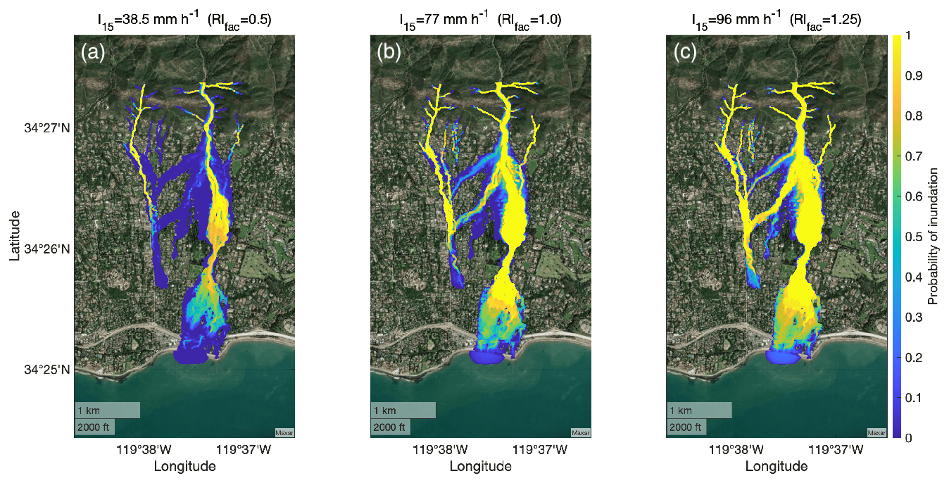 Figure 5Probability of inundation for three rainfall scenarios associated with immediate postfire conditions: (a) (RIfac=0.5); (b) (RIfac=1); (c) (RIfac=1.25).