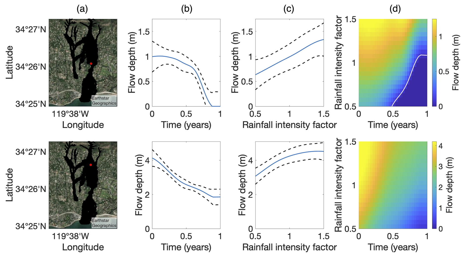 Figure 7Exploration at one location on the fan (top row) and one location in the channel (bottom row). Panels in column (a) indicate locations of all emulated flow depths (black) and those being explored in detail (red). Panels in column (b) show peak flow depth as a function of time since fire (solid blue curve) along with 95 % credile interval bounds (dashed black curves). The hydraulic roughness coefficient and saturated hydraulic conductivity are parameterized as a function of time since fire (Liu et al., 2021) while RIfac=1 and all other parameters set at their central values. (Note that the vertical scales are different; the maximum flow depth on the fan is roughly 1 m, and that in the channel is roughly 4 m.) Panels in column (c) show peak flow depth versus rainfall intensity with the hydraulic roughness coefficient and saturated hydraulic conductivity set to their respectively minimum values, which could be interpreted as a worst-case scenario immediately after a fire, and all other parameters set at their central values. Panels in column (d) contain color maps for maximum flow depth at these two locations varying all combinations of rainfall intensity and time since fire, which determines the hydraulic roughness coefficient and saturated hydraulic conductivity (Liu et al., 2021). The white contours indicate the values of time since fire and rainfall intensity leading to a peak flow depth of 10 cm or more at the selected points.