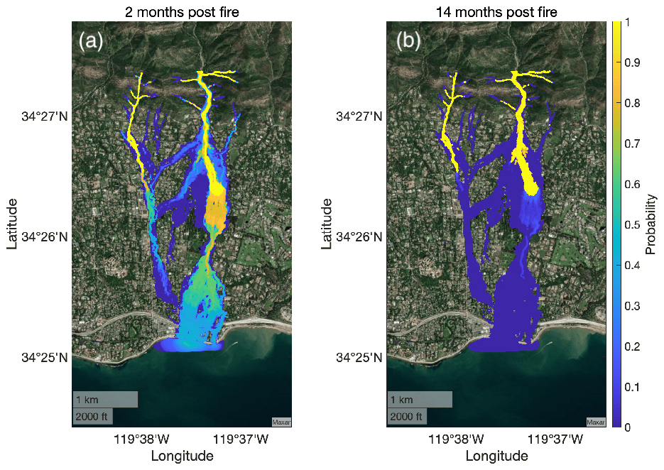 Lastly, we applied the emulator to explore how inundation extent and peak flow depths are driven by temporal changes in saturated hydraulic conductivity and hydraulic roughness that occur as the soil and land surface evolve with time after fire. This analysis was designed to illustrate how emulators can be used to efficiently quantify the temporal persistence of debris flow hazards after fire. We focused, in particular, on exploring the effects of postfire changes in saturated hydraulic conductivity and hydraulic roughness since these two parameters are influenced by fire and Liu et al. (2021) provides guidance for parameterizing how they change with time since fire in the nearby San Gabriel Mountains (Fig. S2). Since the GP emulator enables rapid forward uncertainty quantification, we demonstrated how it can be used to accelerate a Monte Carlo probability of inundation calculation for two cases, namely when the observed storm occurs 2 months and 14 months postfire. These discrete times for evaluating the emulator were chosen since the parameterization from Liu et al. (2021) results in substantial changes in saturated hydraulic conductivity and hydraulic roughness over the first 14 postfire months and we therefore expected to see corresponding changes in the debris flow inundation footprint.