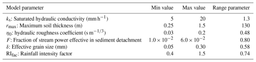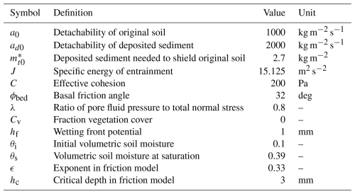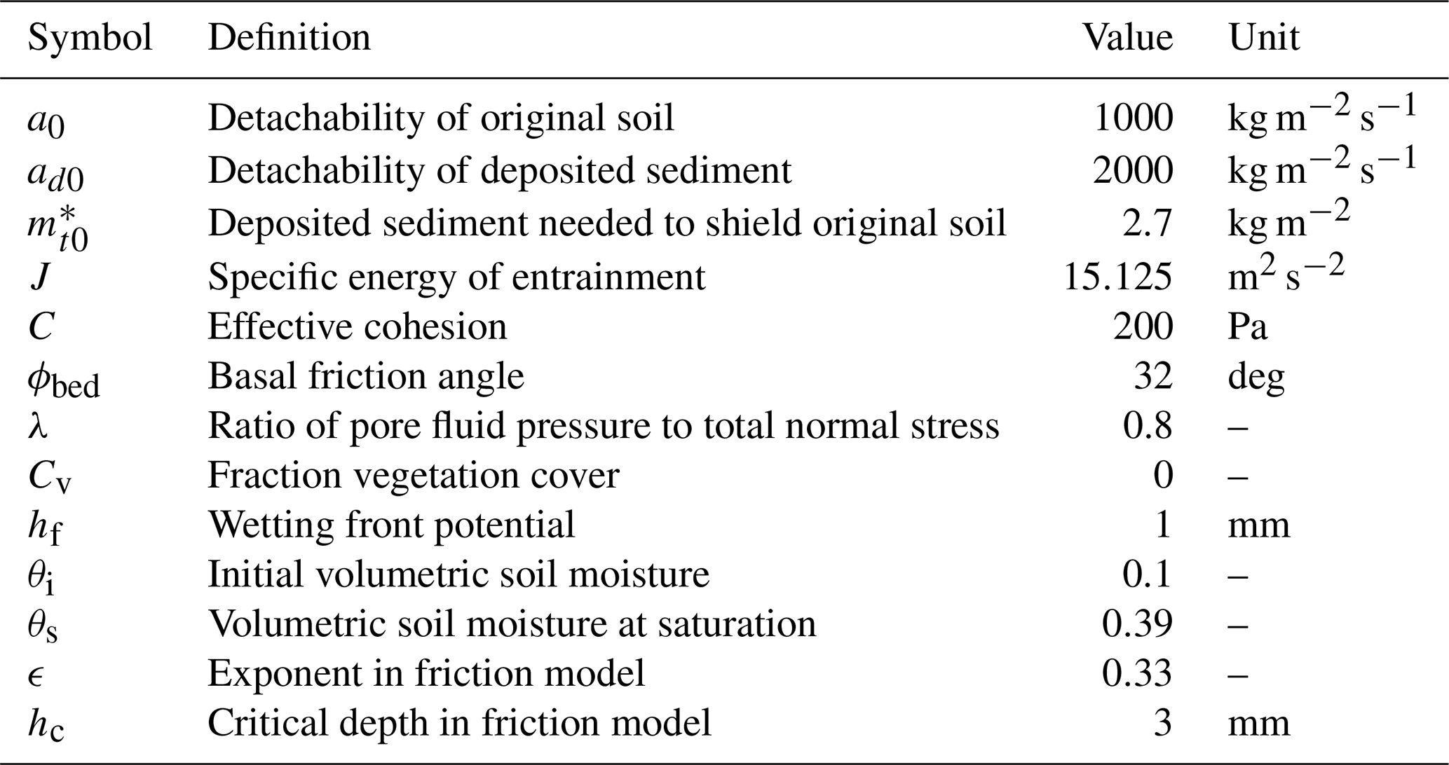 Table 1Parameter ranges with units and PPE range parameters (unit-less) for the six parameters that varied among the N=64 debris flow simulations.