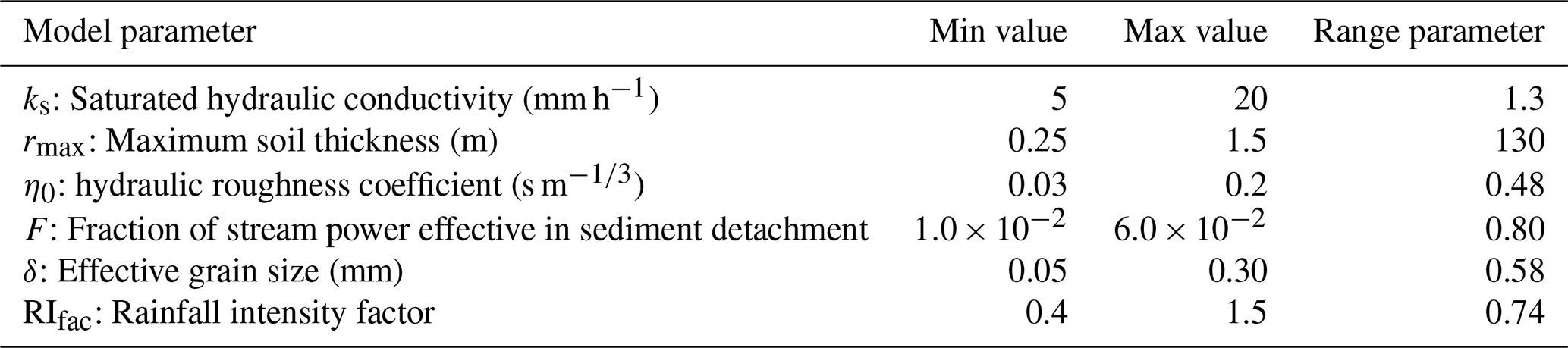 Simulations were designed to explore the extent to which inundated area and peak flow depths on the alluvial fan were influenced by rainfall intensity as well as several parameters that can play critical roles in debris-flow initiation and growth. Selection of these parameters was determined, in part, based on common effects of fire such as the tendency for moderate and high severity fire to reduce soil infiltration rates (Ebel, 2019). The relative influence of these parameters on debris flow runout extent and peak flow depth, however, is less clear. We explored the effect of different rainfall intensities by multiplying the observed 1 min rainfall intensity time series by a rainfall intensity factor (RIfac) that we varied from 0.4 to 1.5. We also varied the representative particle diameter, δ, from 0.05–0.3 mm, the fraction of stream power effective in entrainment, F, from 0.01–0.06, the hydraulic roughness coefficient, n0, from 0.03–0.2, and saturated hydraulic conductivity, ks, from 5–20 mm h−1. We further enforced a maximum soil thickness, rmax, that varied from 0.25–1.5 m to explore the role of sediment availability. All other parameters were fixed (Tables 1, 2). We used a Latin hypercube sampling strategy to generate 64 different parameter sets from the ranges specified above (McKay et al., 1979). Each simulation took several hours to complete on an HPC cluster using up to 16 cores on an intel Xeon Gold 6226R processor.