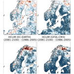 RCMs require information on lateral boundary conditions, which are provided by large-scale global climate models. The HCLIM output we used was based on two boundary GCMs from the Coupled Model Intercomparison Project-Phase 5 (Taylor et al., 2012), EC-EARTH and GFDL-CM3, chosen specifically to capture different types of climate response (Lind et al., 2022). Although both GCMs project warming and increased humidity in northern Europe due to climate change, the response is more intense in GFDL-CM3 compared to EC-EARTH.