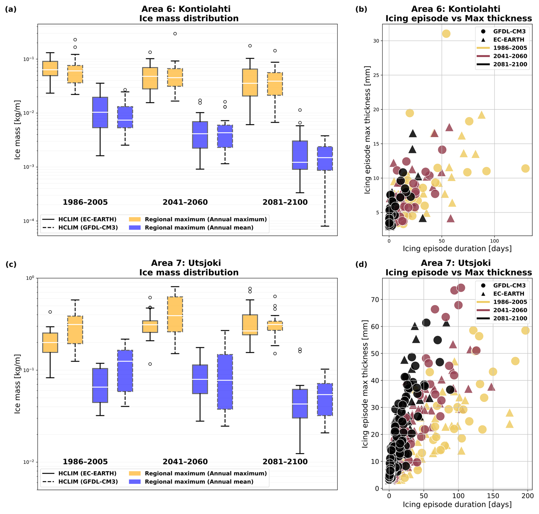 Figure 4Regional results at the height of 50 m from Kontiolahti (a–b) and from Utsjoki (c–d). In panels (a) and (c) distributions of yearly maxima (yellow) and means (blue) are shown for the regional maxima. Boxes with solid lines are EC-EARTH and dashed lines GFDL-CM3. The white line indicates the median value while the boxes cover the interquartile range. Whiskers extend close to the extremes of the distributions, and dots cover the outliers. In panels (b) and (d) the relation of icing episode duration and maximum thickness of ice cover during the episode are shown. Triangles denote EC-EARTH and circles GFDL-CM3 while historical values are shown in yellow, mid-century in red and end-of-century in black. Icing episode denotes to the period when ice cover thickness ≥ 2 mm.