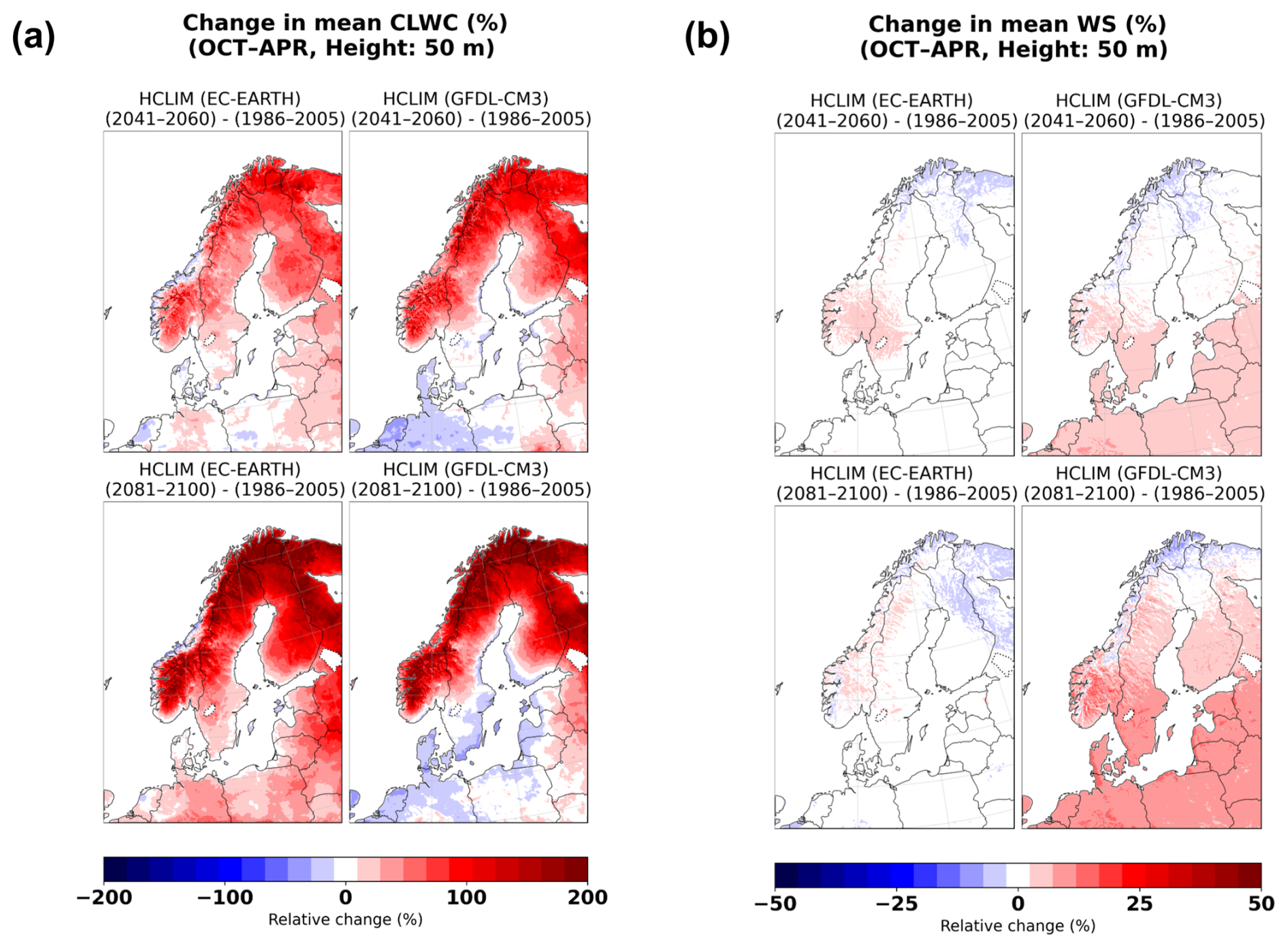 The relative change in the mean CLWC values at the model height of 50 m can be seen in Fig. 7a, while the relative changes in mean wind speed are shown in Fig. 7b. An increasing trend (dominating red colors) is present in most of Fennoscandia for both mid-century and end-of-century for cloud liquid water content, applying particularly for HCLIM with EC-EARTH. With mean wind speed, only minor changes are predicted, at least in HCLIM with EC-EARTH; HCLIM (GFDL-CM3) projects increase of about 10 %–15 % in cold season wind speeds in the southern parts of the domain in end-of-century. Oppositely, GFDL-CM3 simulates there a slight decreasing trend in mean CLWC, by the end-of-century also in most of the Finnish and Swedish coastal areas. In EC-EARTH, a similar pattern is present on the western coast of Norway, while HCLIM with GFDL-CM3 predicts mostly an increasing trend. The absolute changes in the mean CLWC are shown in Fig. A3a and for wind speeds in Fig. A3b. The strongest absolute increase in mean CLWC can be seen at higher altitudes, with an increase of 0.02 g m−3, while the absolute increase in mean wind speed in GFDL-CM3 is around 0.5–1 m s−1.