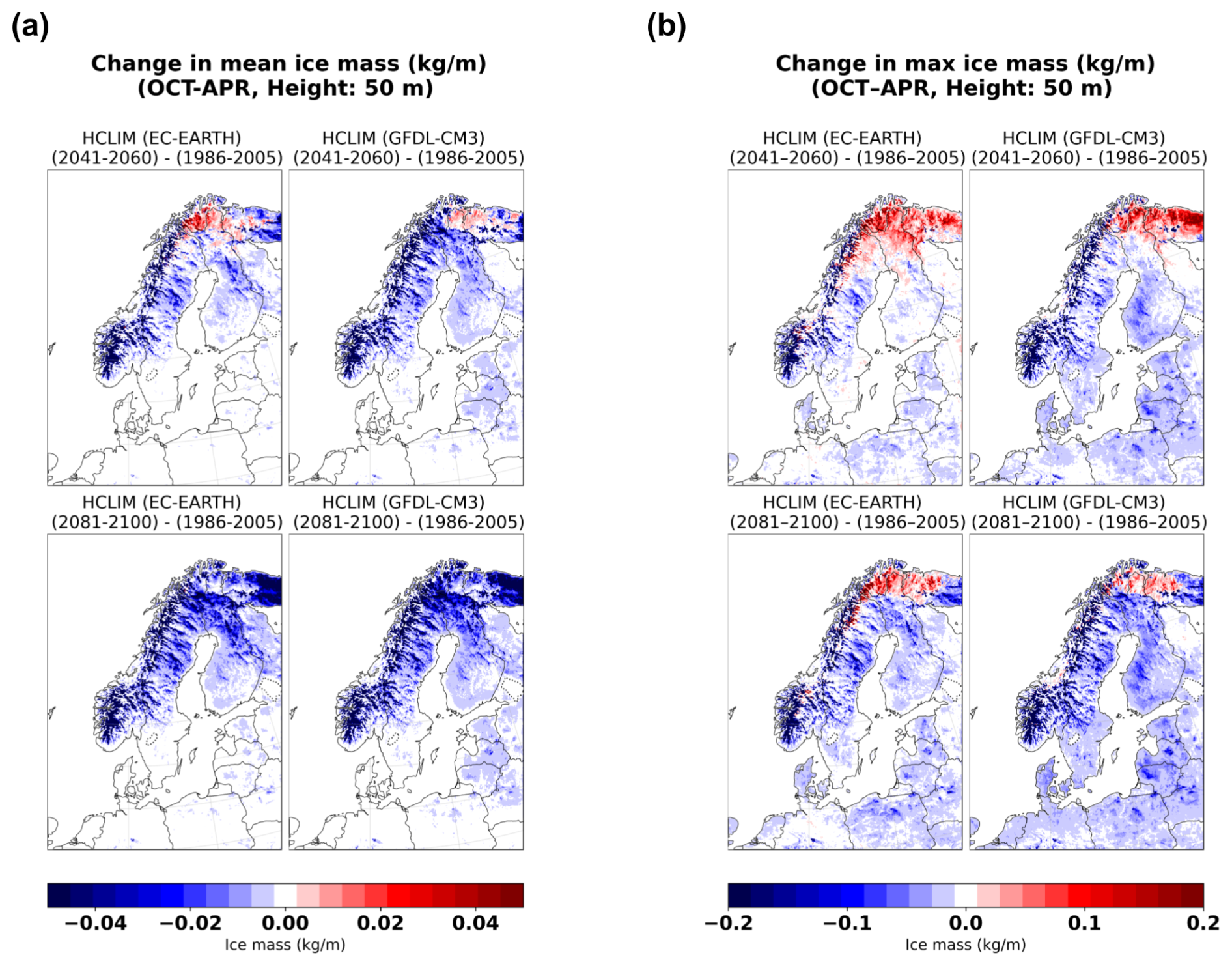 In general, the estimated response of annual ice mass maxima to climate change shows more variation than that of mean ice masses. While southern and central Fennoscandia are predicted to experience largely a decreasing trend, over parts of northern Fennoscandia and Scandinavian mountains, an increasing trend remains until the end-of-century. In HCLIM with GFDL-CM3, this response is more restricted than in HCLIM with EC-EARTH.