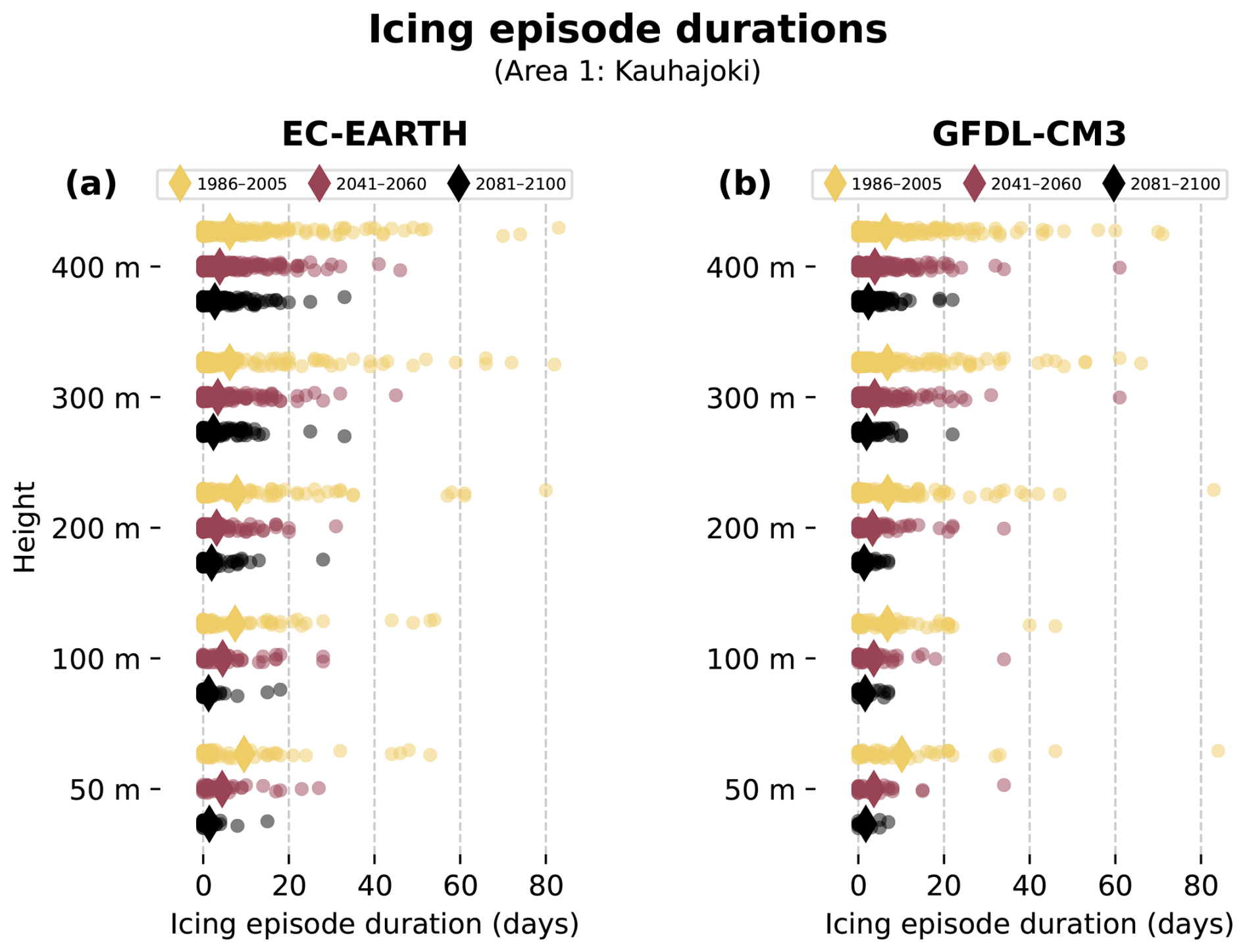 Both GCMs agree that, in general, there is a significant decreasing trend in mean rime ice conditions at the height of 50 m over most of Fennoscandia by the end-of-century, and, similarly, the time spent under icing conditions is predicted to generally decrease in the Fennoscandian region. A similar effect is suggested for the heights of 100–400 m in the five wind power specific test areas, although with increasing turbine heights, icing risks similar to those observed today may still be encountered. In the test areas concerning power transmission lines, the relationship between the maximum thickness obtained during an icing episode and the episode duration was examined. In eastern Finland, both the thickness and the durations are generally expected to decrease, while in northernmost Finland, large maxima are expected even by the end-of-century, but reached with shorter episode lengths.