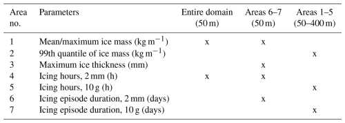 Figure 1 displays the specific areas referenced in Table 1, while supplementary information on the areas, including the relief information, are shown in Table B5. Each area is named according to the municipality or one of the municipalities they fall under. In areas 1–5, which were selected to coincide with existing or planned wind parks, results were calculated for all heights. For power line perspective, separate areas were selected (areas 6–7) and in these regions only results at 50 m height were considered. In areas 6–7, the maximum of all the grid points in the area was determined for each time step, and additional parameters were derived from that, including annual mean and maximum ice masses and icing episode durations. An icing episode is defined as the number of days the ice cover thickness stays over 2 mm. This limit is based on earlier research (Lahti et al., 1997) relating to corona losses caused by icing. In addition, when calculating the annual average of icing hours for the entire Fennoscandian area, 2 mm was used as the threshold for defining an icing hour.