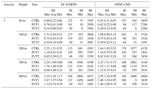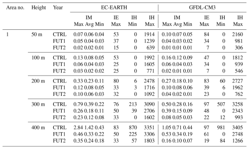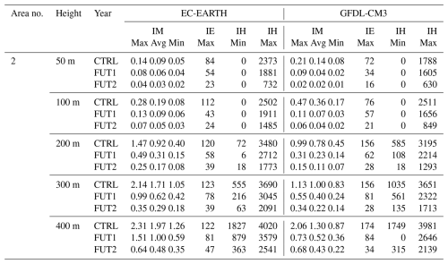Table B2Numerical results for Pello (area 3, Finnish Lapland). CTRL is for the historical period (1986–2005), FUT1 is the mid-century (2041–2060) and FUT2 the end-of-century (2081–2100). For each time period and GCM (EC-EARTH and GFDL-CM3, respectively), six numerical values are given. IM (Max Avg Min) is for the regional maximum, average and minimum of the 99th quantile of ice mass (in kg m−1). IE Max denotes the maximum ice episode duration (days) taken from the average of the area and IH (Min & Max) denote the minimum and maximum icing hour amounts (hours), taken also from the regional average.