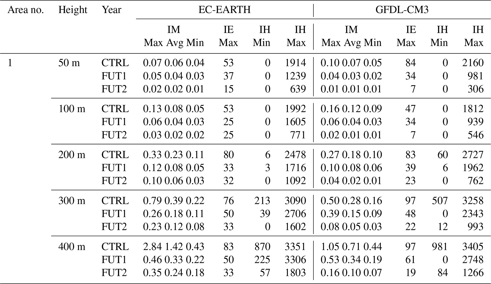 Table 2Numerical results for Kauhajoki (area 1, western Finland). CTRL is for the historical period (1986–2005), FUT1 is the mid-century (2041–2060) and FUT2 the end-of-century (2081–2100). For each time period and GCM (EC-EARTH and GFDL-CM3, respectively), six numerical values are given. IM (Max Avg Min) is for the regional maximum, average and minimum of the 99th quantile of ice mass (in kg m−1), first determined for each grid point separately in the area. IE Max denotes the maximum ice episode duration (days) taken from the average of the area and IH (Min & Max) denote the minimum and maximum icing hour amounts (hours), taken also from the regional average.