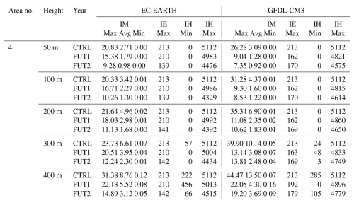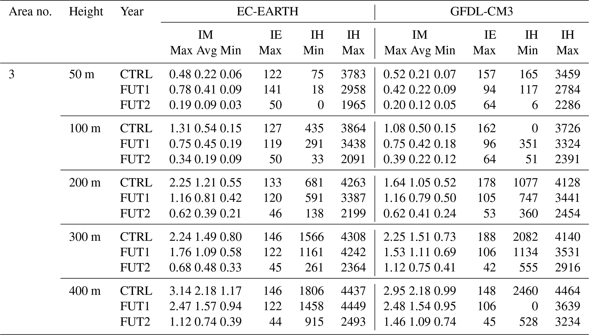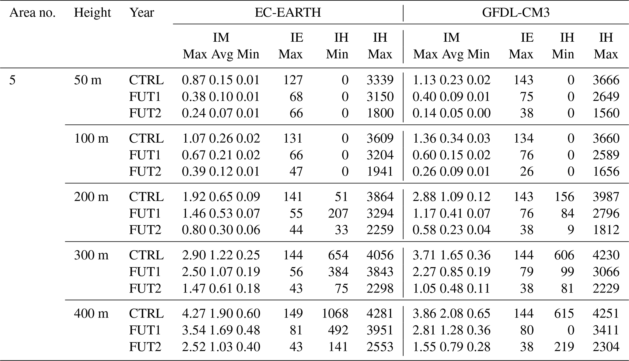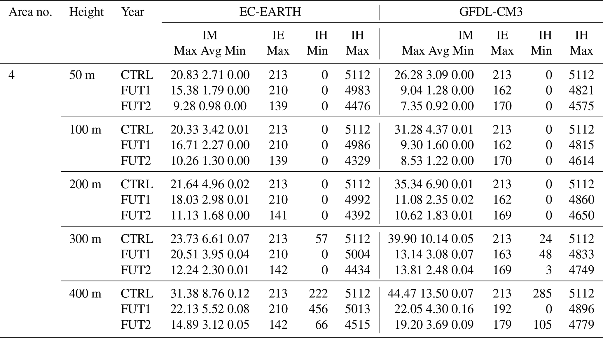 Table B3Numerical results for Narvik (area 4, northern Norway). CTRL is for the historical period (1986–2005), FUT1 is the mid-century (2041–2060) and FUT2 the end-of-century (2081–2100). For each time period and GCM (EC-EARTH and GFDL-CM3, respectively), six numerical values are given. IM (Max Avg Min) is for the regional maximum, average and minimum of the 99th quantile of ice mass (in kg m−1). IE Max denotes the maximum ice episode duration (days) taken from the average of the area and IH (Min & Max) denote the minimum and maximum icing hour amounts (hours), taken also from the regional average.