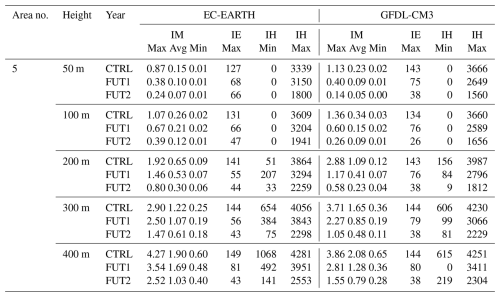 In this section, results from all the five output heights (50, 100, 200, 300, and 400 m) are investigated in the case study area of Kauhajoki located in western Finland along with four additional areas around Fennoscandia. These areas correspond to areas 1–5 presented in Fig. 1, and they coincide with existing or planned wind park locations. All areas cover 42 grid points in total, and while areas 1–3 are in relatively low terrain (average altitudes above sea level in HCLIM data are under 200 m), areas 4–5 are situated in higher terrain with average altitudes of around 550–600 m, with the highest simulated altitude in area 4 (922 m, Table B5). Consequently, here an icing hour is described differently from Sect. 3.2 to better align with wind power standards (≥ 10 g m−1 of ice present in the cylinder). However, an important factor here is to note that the model output was calculated for a cylinder of diameter of 3 cm, which is more suited for transmission lines than for wind turbines.