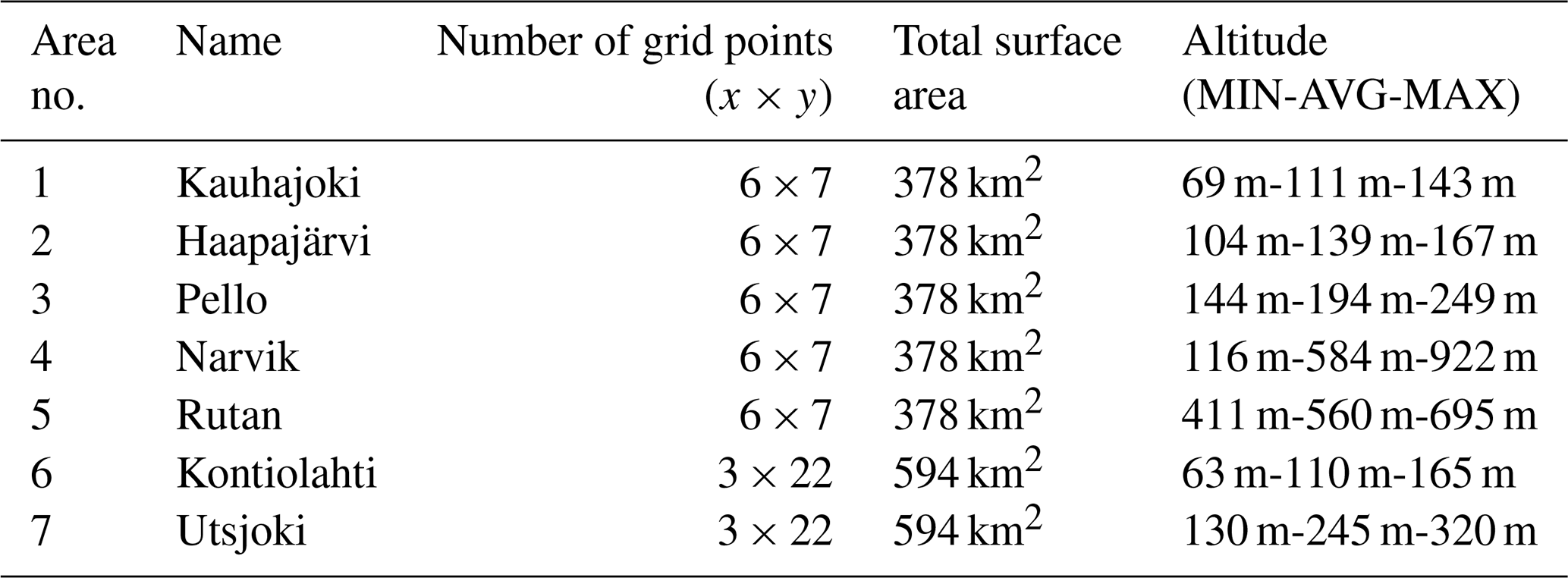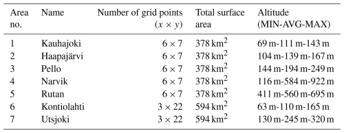 Table B5Supplementary information is shown for areas 1–7. This includes the number of grid points and, thus, the total surface area coverage of each area, and the minimum, average and maximum surface altitudes above sea level (in HCLIM model data). The locations of the areas can be found in Fig. 1.