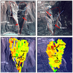 Based on relevant literature and the complex geological conditions in the Baihetan Reservoir area, C-band SAR data can be used to monitor slope deformation. In this region, if the annual deformation rate of a slope exceeds 16 mm yr−1, it is considered to indicate potential landslide hazards. In this study, considering factors such as resettlement activities, frequent human activities, and deformation signal errors within the reservoir area, a threshold of 16 mm yr−1 was set for identifying potential reservoir-bank landslides. Specifically, when the deformation rate of a slope exceeds 16 mm yr−1, it is considered a suspected landslide area. To further assess landslide risks, this study combined SAR deformation signals with the established threshold to initially delineate suspected landslide areas. Additionally high-resolution optical images (e.g., Google Earth imagery) were used to conduct a detailed analysis of features such as color, structure, topographic morphology, landslide boundaries, and cracks for early detection and localization of reservoir-bank landslides (Fig. 5).