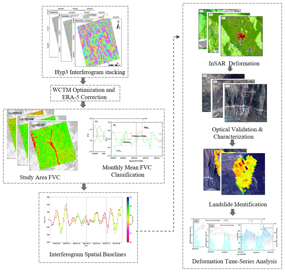 This study uses the HyP3 interferometric data stack, produced by the Alaska Satellite Facility (ASF) cloud platform, as the experimental dataset for interferometric baseline optimization and atmospheric error correction. The data can be accessed and freely applied for online retrieval through the ASF website (https://search.asf.alaska.edu/#/, last access: 12 February 2024), with the application submitted on 18 May 2023. HyP3 is primarily used for processing Sentinel-1 data provided freely by the European Space Agency (ESA). Based on the ASF data platform, users can retrieve and query the Sentinel-1 SAR data archive. The main interferometric products available include wrapped and unwrapped interferograms, coherence maps, amplitude images, water mask images, DEMs, and look vector maps, etc. HyP3 utilizes Amazon's infrastructure services, including Amazon Elastic Compute Cloud (EC2) and Amazon Simple Storage Service (S3). It provides users with customized, on-demand synthetic aperture radar (SAR) processing services, eliminating the need for users to purchase or install complex SAR processing software and acquire advanced SAR processing skills. After the user submits an application through the ASF Vertex website or using the HyP3 Python SDK, the system automatically processes the interferometric data using GAMMA software hosted by Amazon Web Services (AWS). The process uses the Copernicus GLO-30 DEM to remove terrain phases and applies the minimum cost flow (MCF) method for phase unwrapping, ultimately generating interferometric products suitable for coherence analysis and with moderate pixel spacing. HyP3 data effectively addresses the issues associated with traditional interferometric processing methods, which require significant disk space, computational resources, and processing time, offering a new approach for large-scale reservoir bank landslide detection and monitoring.