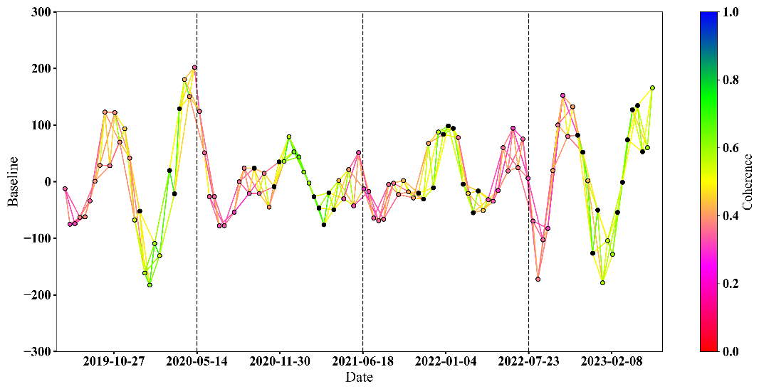Figure 3Spatio-Temporal Baseline Network of All Interferograms (the red dashed line represents a spatial baseline value of 0, the black dashed lines indicate December 31 of each year, and the red-to-blue gradient represents the average coherence of each interferogram).