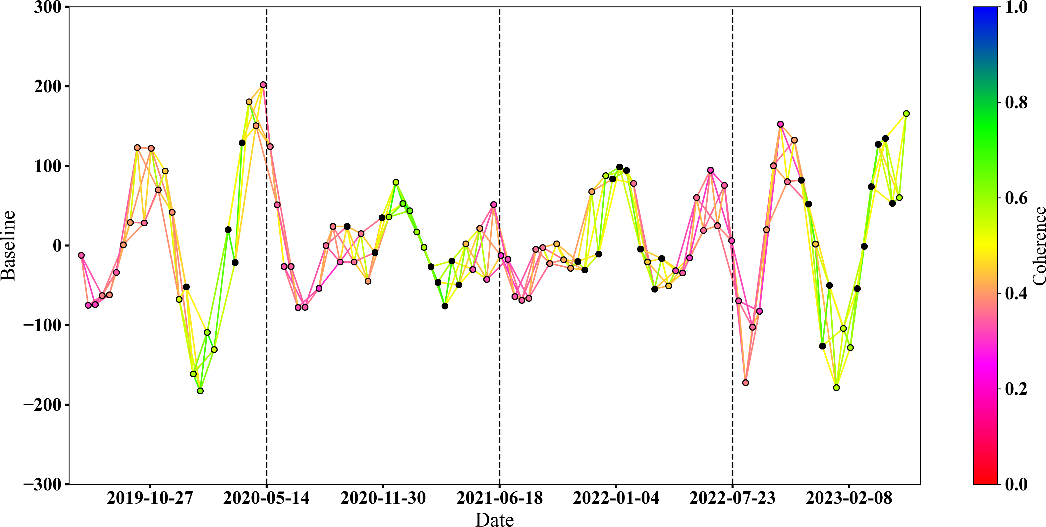 The third category of methods is based on coherence coefficient for interferogram selection, where interferograms are chosen by setting a coherence coefficient threshold and optimizing the interferometric baseline network. For example, Tao et al. (2021) used a custom coherence coefficient threshold for interferogram selection; Wang et al. (2022, 2023) directly used the average coherence between SAR images as a baseline constraint indicator to optimize interferogram selection; Zhang et al. (2024) used average segmented coherence threshold coefficients to select interferograms in landslide creep identification and monitoring in the Xiaojiang River Basin. The coherence coefficient of InSAR interferograms is influenced by the spatiotemporal baseline of SAR images and external environmental coupling, which can accurately reflect the quality of the interferogram. Setting a coherence coefficient threshold is a reliable method for generating a robust interferometric baseline network. Custom coherence coefficient thresholds are often established through prior knowledge or comparative pre-experiments. However, this method is highly subjective and suffers from issues such as insufficient interferogram samples for pre-experiments. Moreover, the set thresholds cannot account for the intermittent coherence problems caused by vegetation changes, while the average coherence coefficient threshold overly relies on simple statistical patterns and fails to consider the impact of vegetation cover changes on the coherence of interferograms.