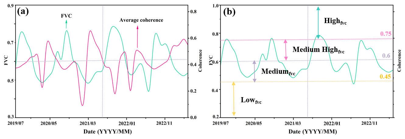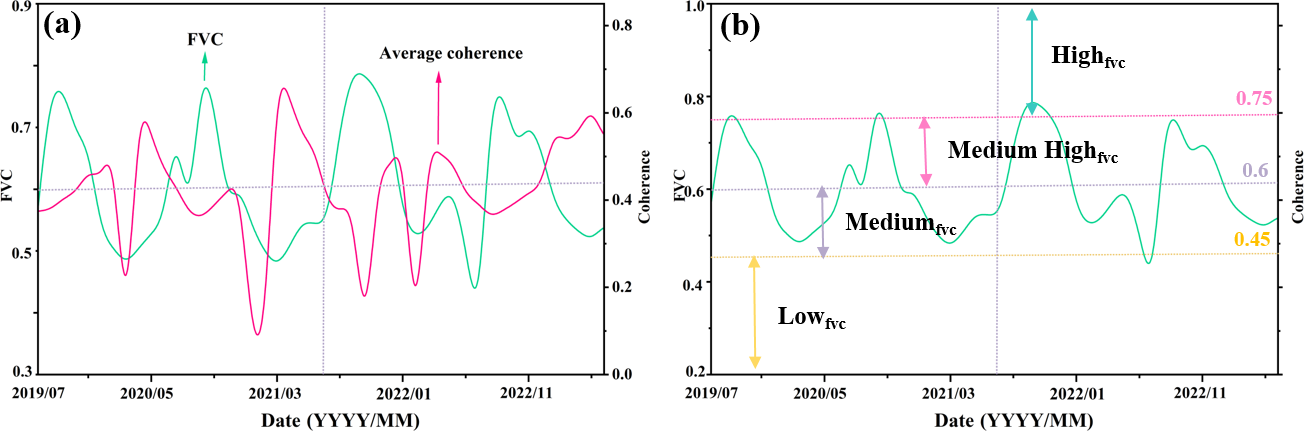 Figure 4Monthly Average Vegetation Coverage Time Series. Panel (a) shows the relationship between monthly average vegetation coverage and monthly average coherence coefficient; panel (b) presents the classification results of monthly average vegetation coverage levels. The black dashed line represents the midpoint date of the study period.