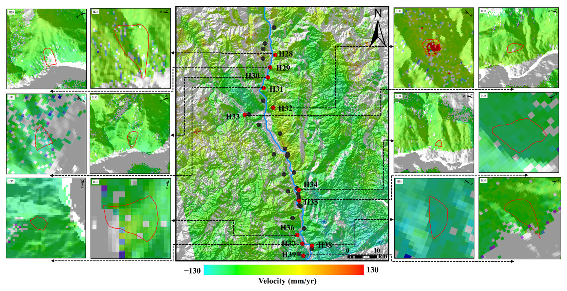 A total of 39 potential reservoir-bank landslides were identified in the Baihetan Reservoir area Among the early identified landslides, 27 were historical landslide hazards, numbered H1-H27; 12 new landslides were identified, numbered H28–H39. The interpretation of the remote sensing images is shown in Fig. 6.