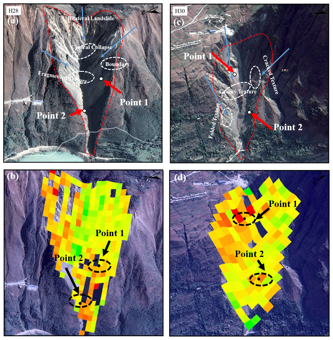 Located on the western bank of the lower Baihetan Reservoir area in Shuicaozi Village, Huidong County, the H30 landslide displays a tongue-shaped irregular boundary with prominent concave morphology. The slope deformation manifests primarily as compressional displacement from both sides toward the center (Fig. 7c), with greater deformation intensity observed on the right slip surface. Fractures and debris deposits identified in the central portion of the landslide body, coupled with pronounced deformation zones at the upper-left and lower-right sections (Fig. 7d), further confirm its active deformation state.