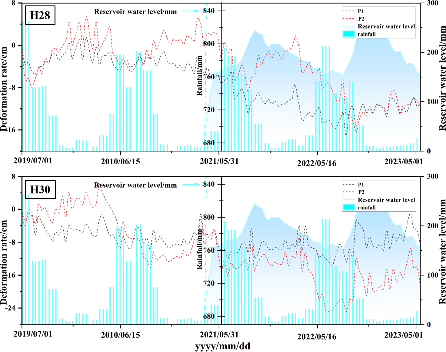 This study analyzed the temporal evolution characteristics of reservoir-bank landslide deformation. Characteristic points with significant deformation (H28 P1, H28 P2, H30 P1, and H30 P2) were selected from the H28 and H30 landslide areas in the Baihetan Reservoir, and time-series deformation curves were constructed (Fig. 8).