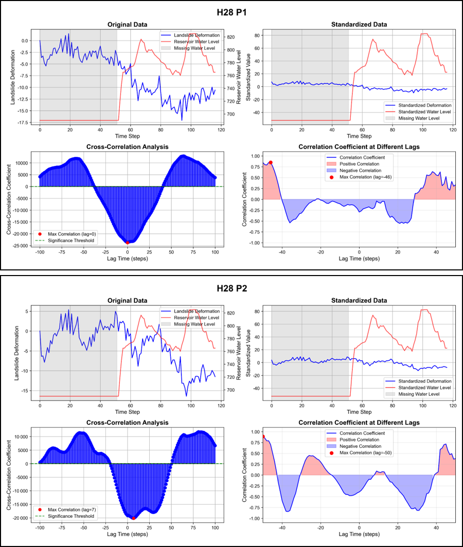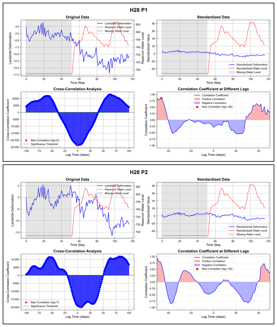 In summary, reservoir-bank landslide deformation is significantly affected by water level variations. Signal cross-correlation analysis enables clear quantification of this time-lag effect: the lag steps for characteristic points in the H28 area range from 40 to 50 steps, while those in the H30 area range from 22 to 42 steps. These quantified results provide data support for understanding the temporal response patterns of landslide deformation. Furthermore, they emphasize the importance of real-time monitoring and dynamic updates of reservoir-bank landslides for regional geological hazard prevention and mitigation.