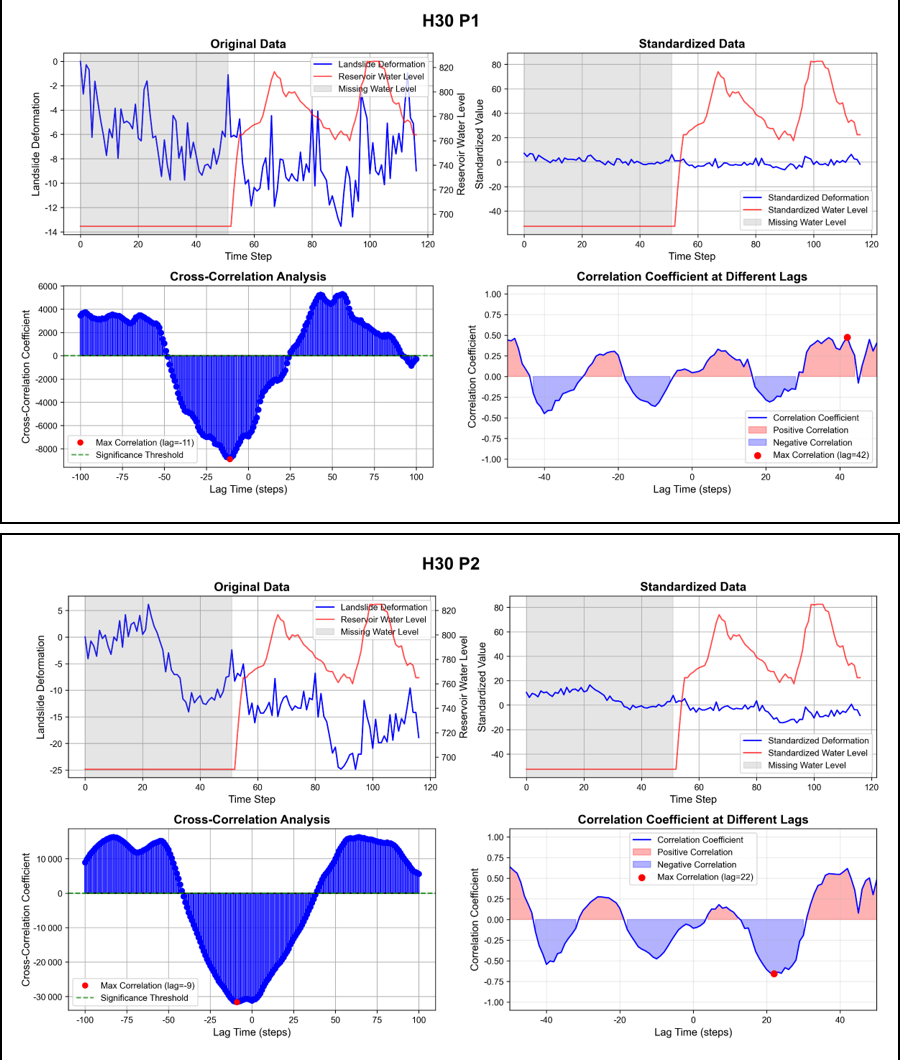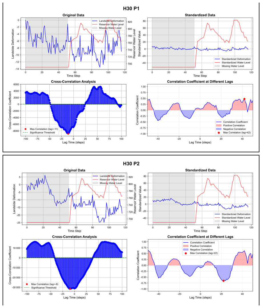 Figure 10Analysis of Time-Lag Effect Between Deformation and Water Level for Characteristic Points of the H30 Landslide.