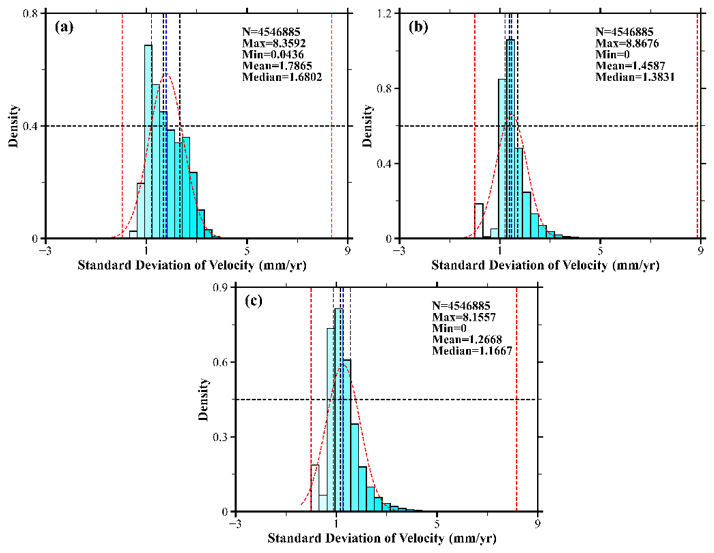 Figure 11Standard Deviation of Deformation Rates: (a) results without interferometric baseline threshold optimization, (b) results with interferometric baseline optimization based on average coherence, (c) results with interferometric baseline optimization using the WCTM method.
