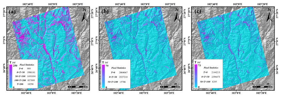 In addition, the full-phase ambiguity results of the loop phase closure check for phase unwrapping also validate the performance of the optimized interferometric baseline using the WCTM method proposed in this paper. The full-phase ambiguity of the loop closure describes the “periodicity” or “ambiguity” of radar phase during the phase unwrapping process in time-series InSAR technology, and is used to evaluate the quality of phase unwrapping and possible phase unwrapping errors. Figure 13 shows the full-phase ambiguity of the loop closure obtained using the three methods. It is not difficult to observe that, compared to the short time-space baseline threshold method, the optimization of interferometric baseline threshold using the coherence coefficient of the interferogram yields more robust phase unwrapping results, with a significant improvement in the quality of phase unwrapping. The non-zero values of the full-phase ambiguity of the loop closure are effectively reduced. By considering the monthly variation of InSAR coherence and vegetation cover, the WCTM method leads to an increase of 140 146 good unwrapping results (Tint = 0) compared to the average coherence threshold method, while the unwrapping errors with closure differences greater than 50 (50 times 2π) are reduced by 7411, indicating that the WCTM method effectively reduces the noise level detected by time-series InSAR technology and demonstrates good applicability in deeply-cut mountain canyon areas.