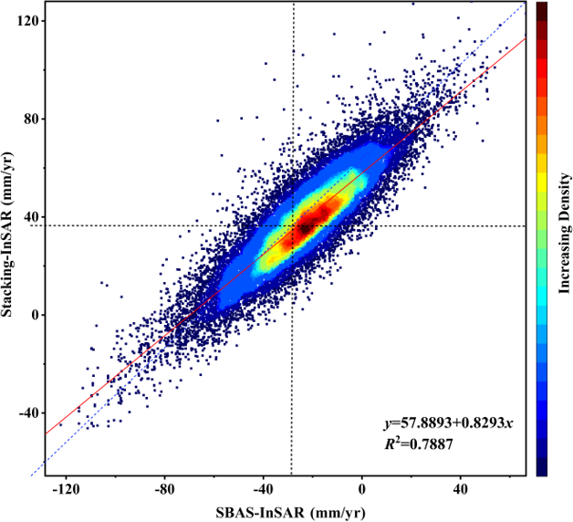 This paper describes a method for optimizing the interferometric baseline threshold of the HyP3 interferogram stack using the proposed WCTM method to obtain InSAR deformation signals for deeply incised high mountain canyon areas. The accuracy of the deformation signals is limited by the HyP3 interferogram stack products processed and released by the ASF. Due to the special terrain and topography of the Baihetan Reservoir area, the descending track data experiences significant geometric distortion. To improve the accuracy of the InSAR deformation signals and reduce the impact of geometric distortion on reservoir bank landslide identification results, we selected ascending track data from the HyP3 interferogram stack as the experimental dataset for the WCTM method. By comparing with historical landslide data from 2021, the spatial locations of the early-identified reservoir-bank landslides showed a high degree of similarity to the historical landslides, indirectly validating the accuracy of the InSAR results. However, due to the lack of GNSS observational data in the study area, we were unable to compare the detected InSAR deformation signals with GNSS data on a time-series scale. To quantitatively analyze the reliability of the InSAR results, we performed cross-validation by comparing deformation results obtained using different techniques on the same track. We used the HyP3 interferogram stack mentioned in Sect. 2.2 for Stacking-InSAR processing, obtaining the average phase velocity for the study period (Fig. 14b), and then performed a combined analysis with the deformation rates obtained using the SBAS-InSAR technique in Sect. 4.3. We randomly selected 25 141 deformation points from areas with consistent deformation trends (Fig. 14) for regression analysis (Fig. 15). The cross-validation results between SBAS-InSAR and Stacking-InSAR show an R2 value of 0.79, which demonstrates that the surface deformation information obtained from both SBAS-InSAR and Stacking-InSAR methods is reliable on both temporal and spatial scales. Additionally, the cross-validation results also verify the accuracy and reliability of the time-series InSAR data optimized using the WCTM method proposed in this study.