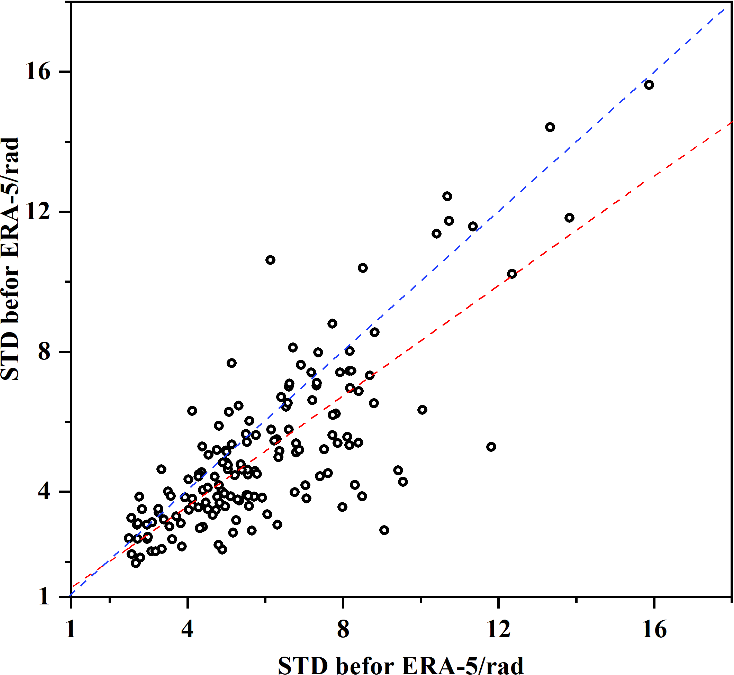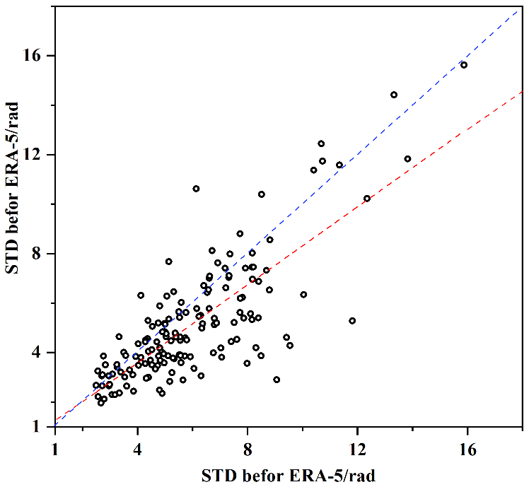 The SBAS-InSAR deformation inversion results are often affected by phase unwrapping errors and atmospheric delay errors. Optimizing these errors can significantly improve monitoring accuracy. The above experiments demonstrate that by adjusting the coherence threshold and optimizing the full-wavelength ambiguity of the phase closure, the WCTM method effectively improves the stability of phase unwrapping. Based on this, this study combined the ERA-5 meteorological reanalysis product released by the ECMWF to correct atmospheric delay errors, and compared the phase standard deviation of interferograms before and after correction (Fig. 16). The results show that after ERA-5 correction, the phase standard deviation significantly decreased, with the maximum phase standard deviation reduced from 11.81 to 5.27 rad. Notably, 71.2 % of the interferogram phase standard deviations showed significant improvement, while only 28.8 % of interferograms were negatively affected, with the maximum negative standard deviation being −4.48 rad. This indicates that the ERA-5 product, with its high spatiotemporal resolution, can effectively eliminate atmospheric delay errors in InSAR monitoring, and is particularly well-suited for deep-cut mountain canyon areas.