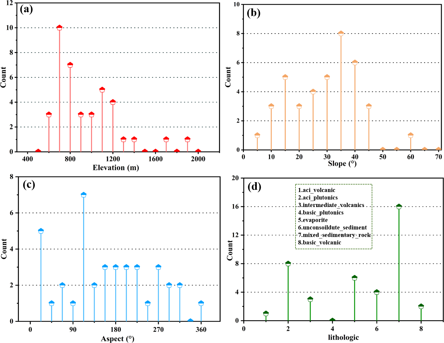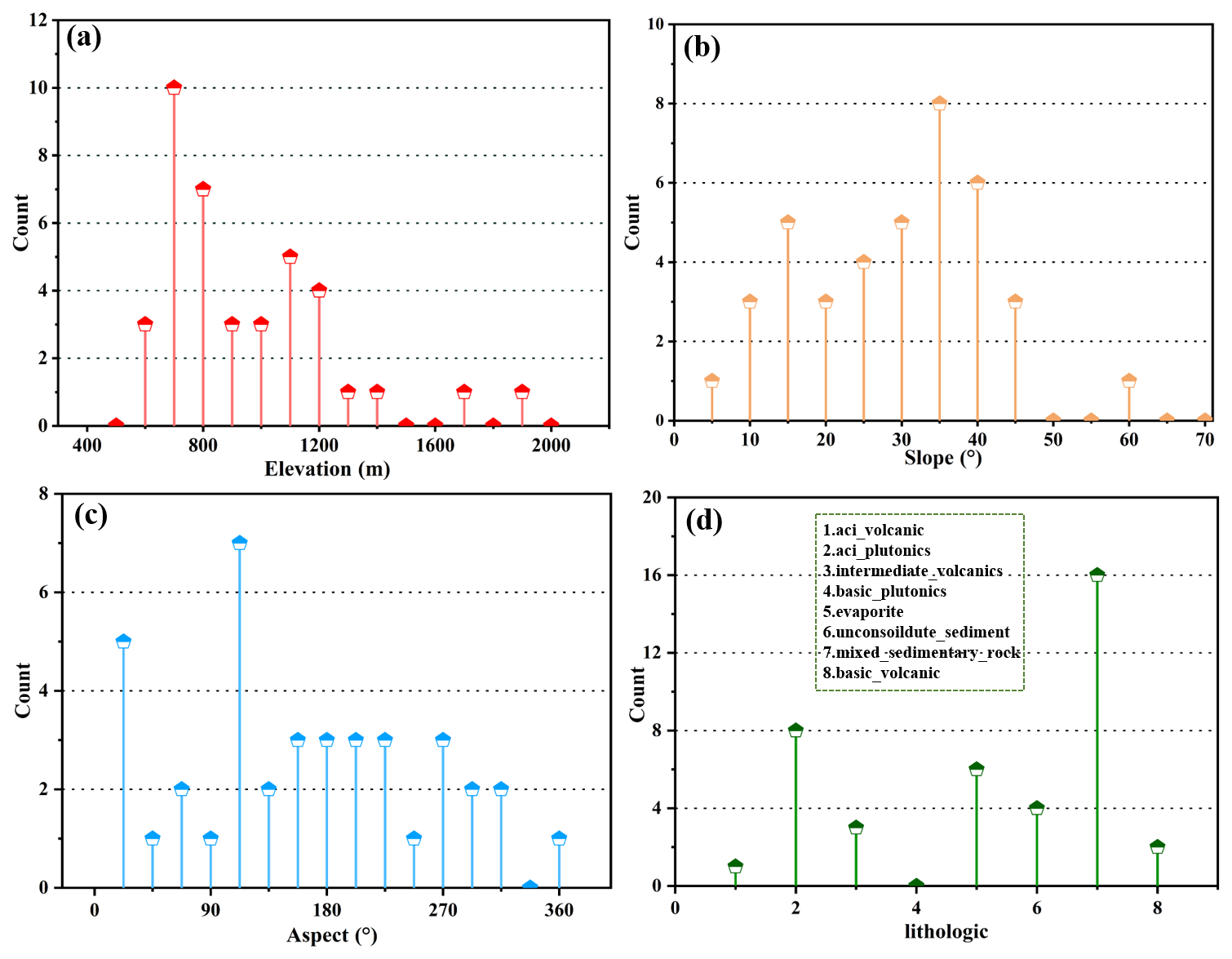 Statistical analysis revealed that most reservoir-bank landslides in the Baihetan area occur within an elevation range of 600 to 1400 m and on slopes between 30 and 45°. The predominant slope aspects are northeast, east, and northwest. Lithologically, these landslides mainly develop on carbonate rocks, intermediate volcanic rocks, mixed sedimentary rocks, and siliceous clastic sedimentary rocks.