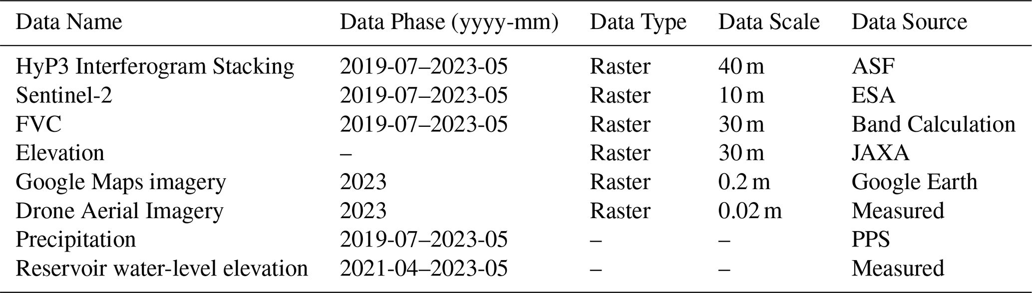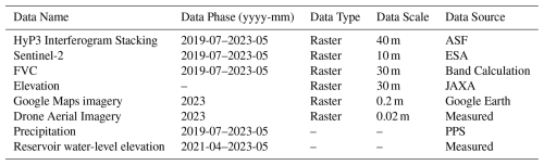 The auxiliary datasets used in this study include several key sources. Sentinel-2 data (Level 2A) with a 10 m spatial resolution, including red, blue, and green bands, was utilized to refine the estimation of surface vegetation coverage (Fraction of Vegetation Coverage, FVC) in the study area. This data was accessed online from Copernicus (https://dataspace.copernicus.eu/, last access: 20 August 2024). Additionally a 30 m resolution Digital Elevation Model (DEM) from the ALOS WORLD 3D dataset, provided by the Japan Aerospace Exploration Agency (JAXA), was used to calculate topographic features like mountain shadow, slope, aspect, and curvature. This dataset was accessed from ALOS (https://search.asf.alaska.edu/#/, last access: 1 July 2024). High-resolution Google Earth imagery with a 0.2 m spatial resolution was employed for location annotation of reservoir-bank landslides and for overlaying the acquired InSAR deformation results. This data was accessed from Google Earth (https://earthengine.google.com/, last access: 18 July 2024). Drone aerial imagery with a 0.1 m resolution was also used for field surveys to validate landslide identification results and to observe the Optical Characteristics of typical reservoir-bank landslides, with the imaging conducted on 14 May 2023. Precipitation data, acquired from the precipitation processing system on 15 July 2023, were used to analyze rainfall patterns, and Reservoir water-level elevation data were measured in the field during the research period. These datasets, summarized in Table 1, provided comprehensive support for the research.