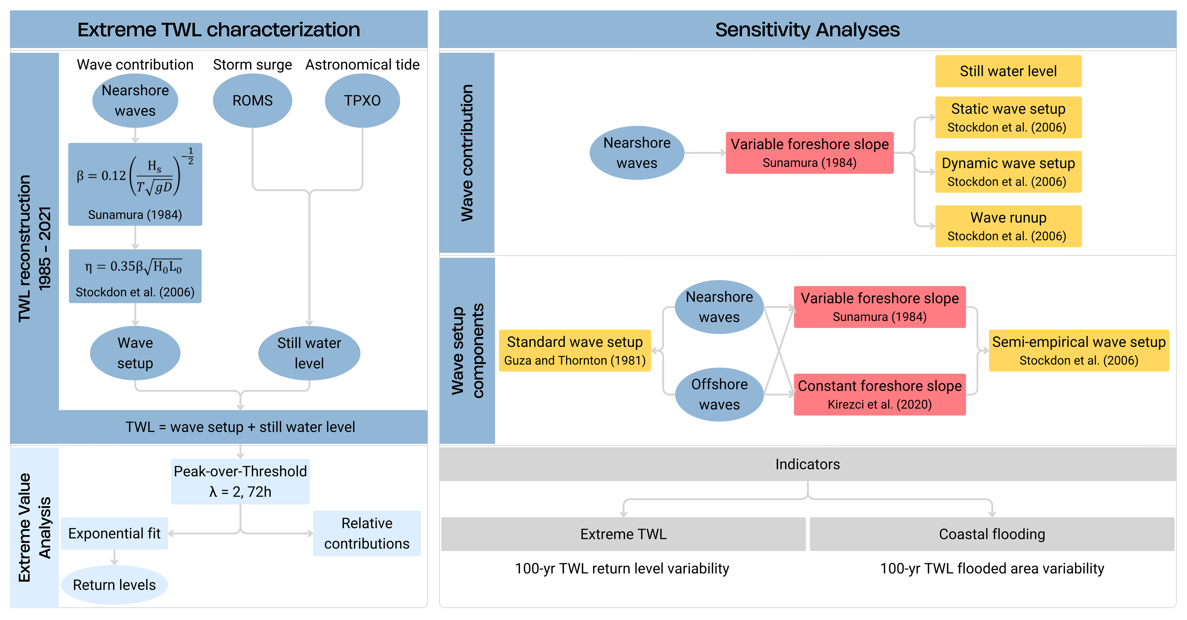 Figure 1Methodology applied in the present study for TWL hindcast reconstruction and extreme value analysis (left). Sensitivity analyses applied to the wave contribution and wave setup components (right).