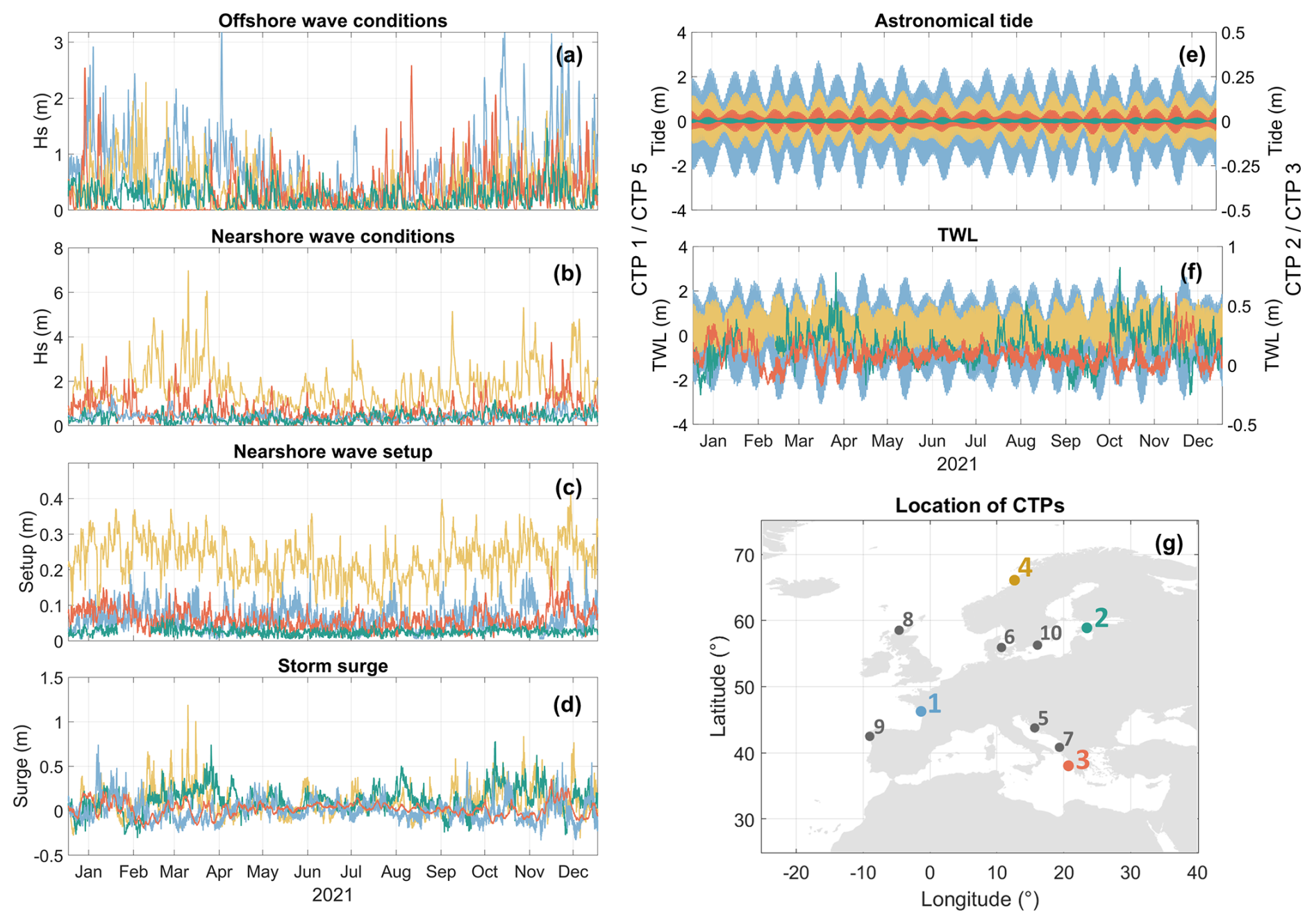Figure 2 presents the 2021 hindcast of all variables used in this study for four coastal target points (CTP) in which we reconstructed the TWL. The CTPs used as examples throughout this study were selected from a list of test points selected with a K-means clustering technique applied to the relative contributions of the TWL components (see Fig. S8). Point 1 is located on the Atlantic coast of France, point 2 in Estonia in the Baltic Sea, point 3 in Greece in the Mediterranean Sea, and point 4 in Norway (Fig. 2g). These points represent the centroids of the four most distinct K-means clusters. Offshore wave conditions (Fig. 2a) were downscaled to the coast (hereinafter, nearshore wave conditions; see Fig. 2b), from which wave setup (Fig. 2c) was calculated to represent the wave component. Storm surge (Fig. 2d) and astronomical tide data from TPXO (Fig. 2e) were then added to the wave setup hindcast to obtain the TWL (Fig. 2f) time series. As a consequence, the variability of the TWL reflects the heterogeneity of the spatial distribution of its three components. The distinction between offshore and nearshore wave conditions is evident, particularly at points 3 and 4 where notable differences are observed. The results highlight that while the TWL time series of points 1 and 4 are primarily influenced by tides, point 2 appears to be dominated by storm surge. However, although point 4 shows smaller oscillations, higher wave setup values raise its TWL time series, unlike point 1, where the series remains centered around 0 m.