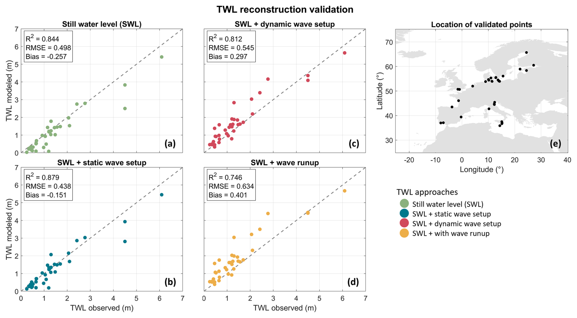 Direct validation of TWL as a composite variable remains challenging at continental scale due to the scarcity of observations capturing wave-induced water-level contributions. Consistent with previous large-scale studies, TWL reliability is therefore assessed through the validation of its individual components and by comparison with documented historical extreme events. This approach provides confidence that the reconstructed TWL hindcast is robust and appropriate for the large-scale flood hazard analyses targeted in this study.