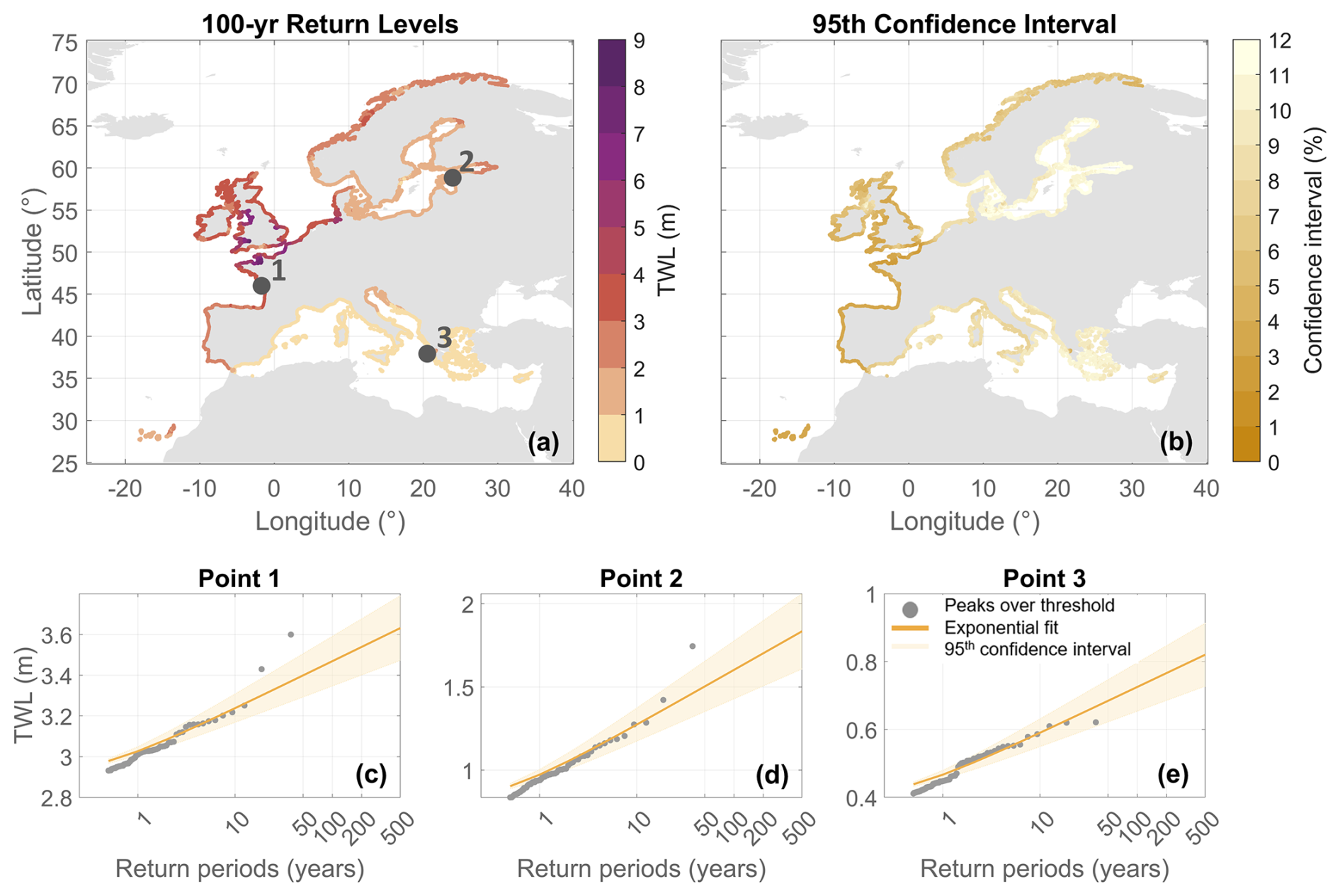 Figure 5(a) Spatial distribution of the 100 year return period TWL resulting from POT with an exponential fit. (b) Spatial distribution of the 95th confidence interval relative to the 100 year TWL event, in percentage. (c–e) Examples of individual CTPs with the exponential fits applied to the POT samples to extract return levels of TWL.