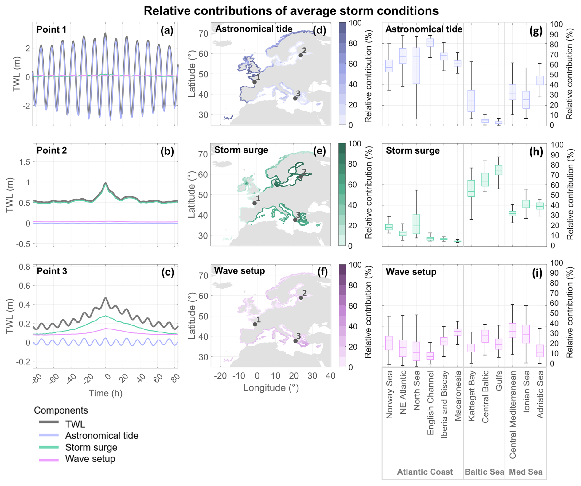 Figure 6(a–c) Examples of individual CTPs with average storm conditions per TWL component. Spatial distribution of mean relative contributions of (d) astronomical tide, (e) storm surge, and (f) wave setup under extreme conditions. (g–i) Dispersion of relative contributions of TWL components per European basin, grouped per European region.